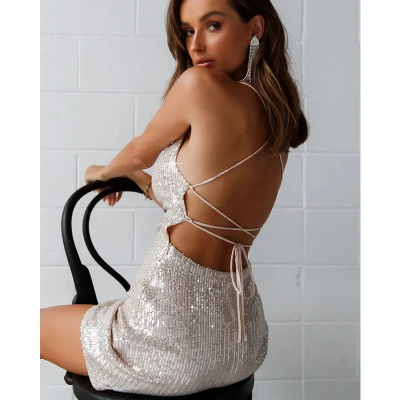 Tavimart Women's Silver Sequined Backless Mini Dress, Deep V Neck, Off Shoulder, Sexy Strap Dresses, Christmas Party Club, Autumn