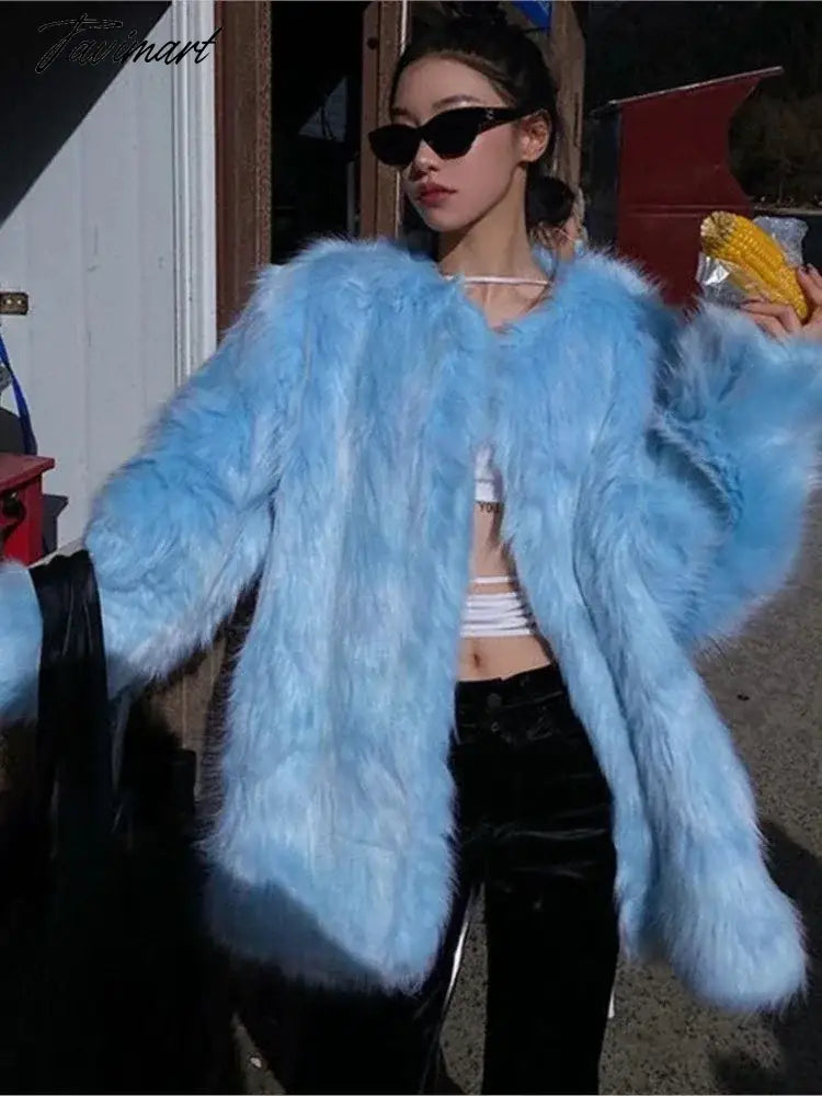 Tavimart Super Hot Women's Winter Fluffy Jacket Coats Elegant Blue Faux Fur Coats Female Long Sleeve Thick Warm Outerwears Lady Oversize