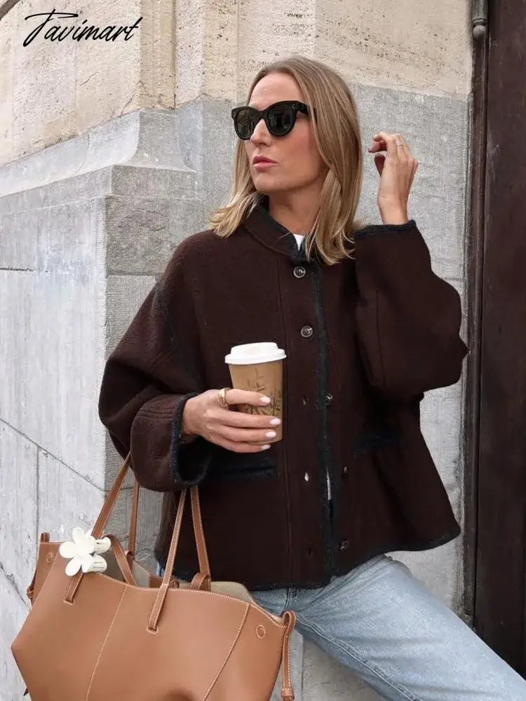 Tavimart Solid Faux Woolen Blend Jacket For Woman 2024 Winter Warm Solid V-neck Single Breasted Loose Coats Fashion New All-matc Jackets
