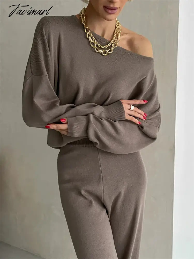 Tavimart One Shoulder Sexy Knit Two Piece Set Casual 2 Piece Tracksuit Women Knitted Pants Suit Pants and Top Set Matching Sets For Women