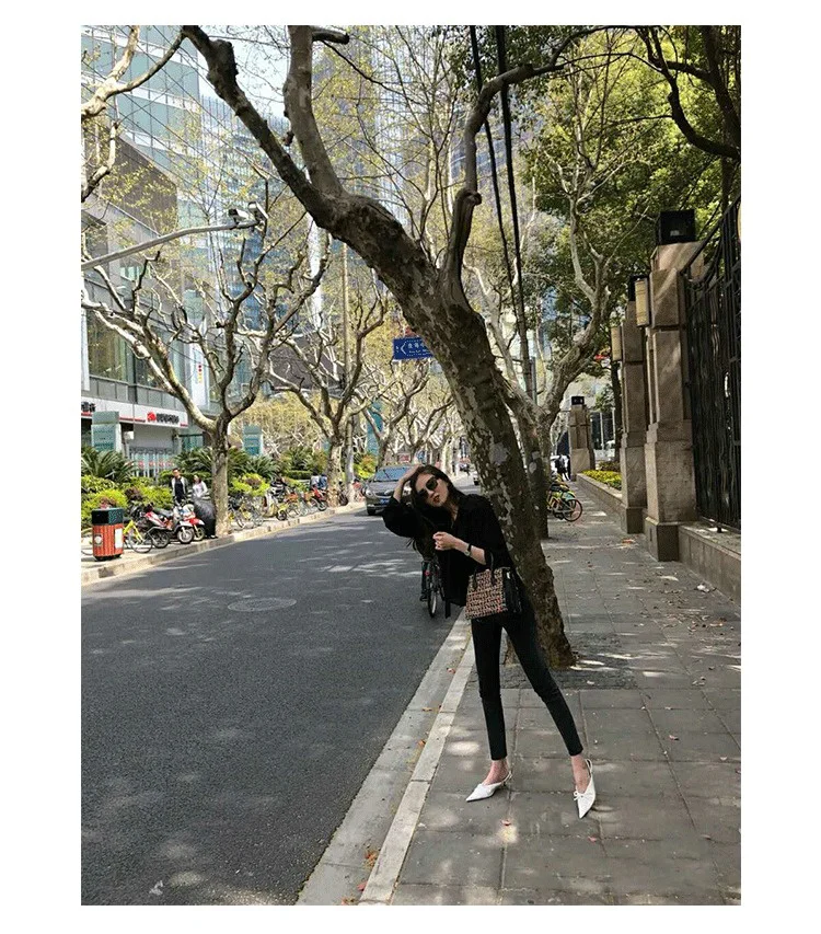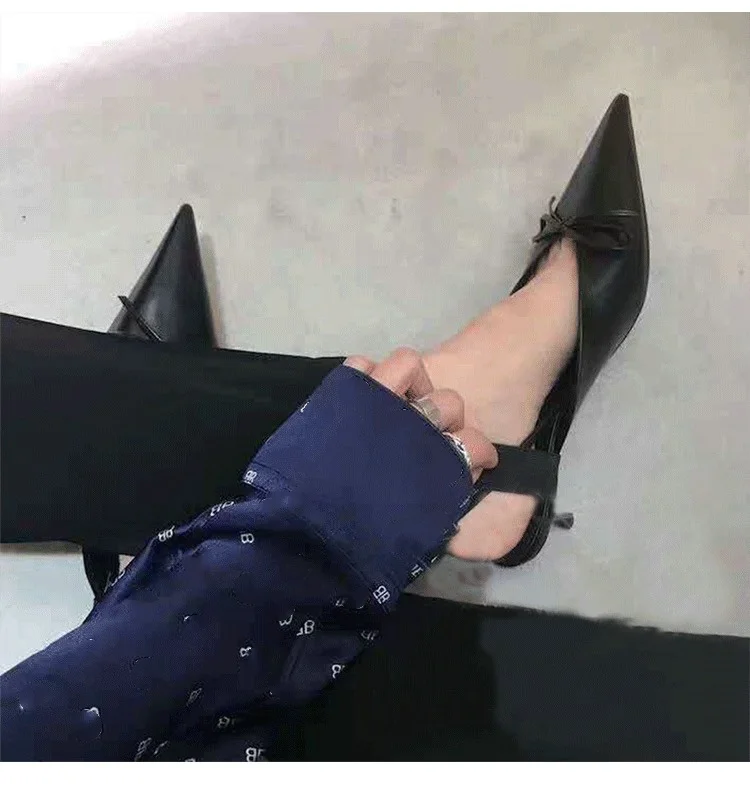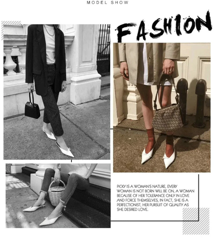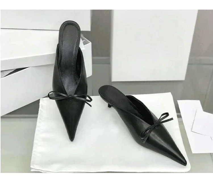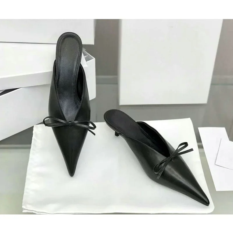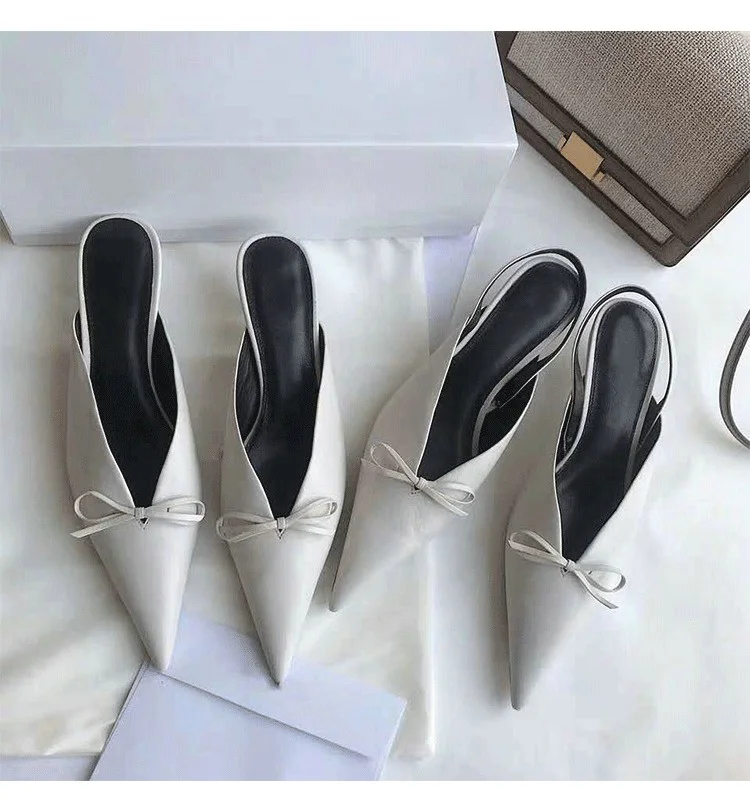 TAVIMART - Super Hot Pointy Bow V-Top Skinny Heel Bun Towing Summer Muller Shoes Fashion Leather Low Heel Pumps