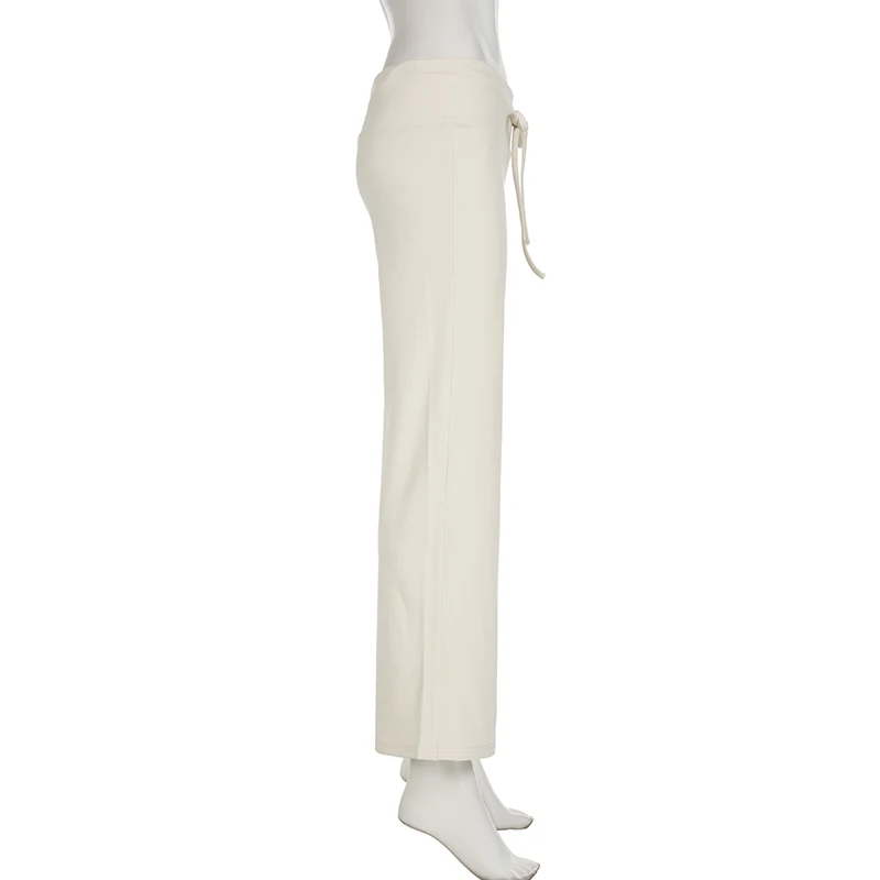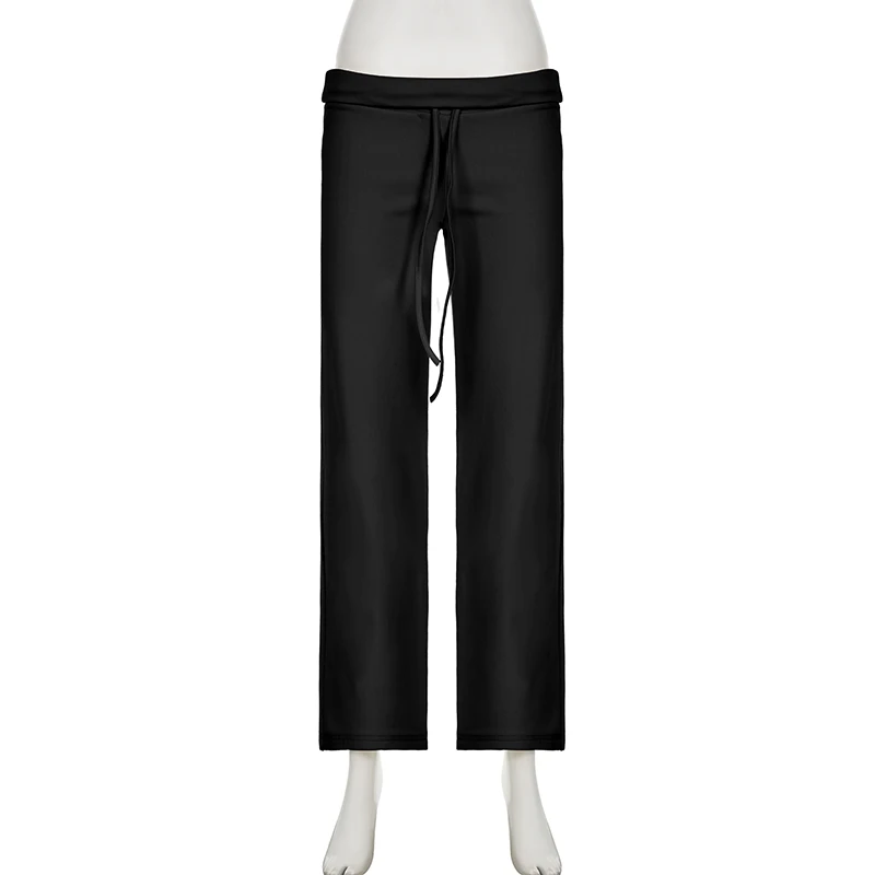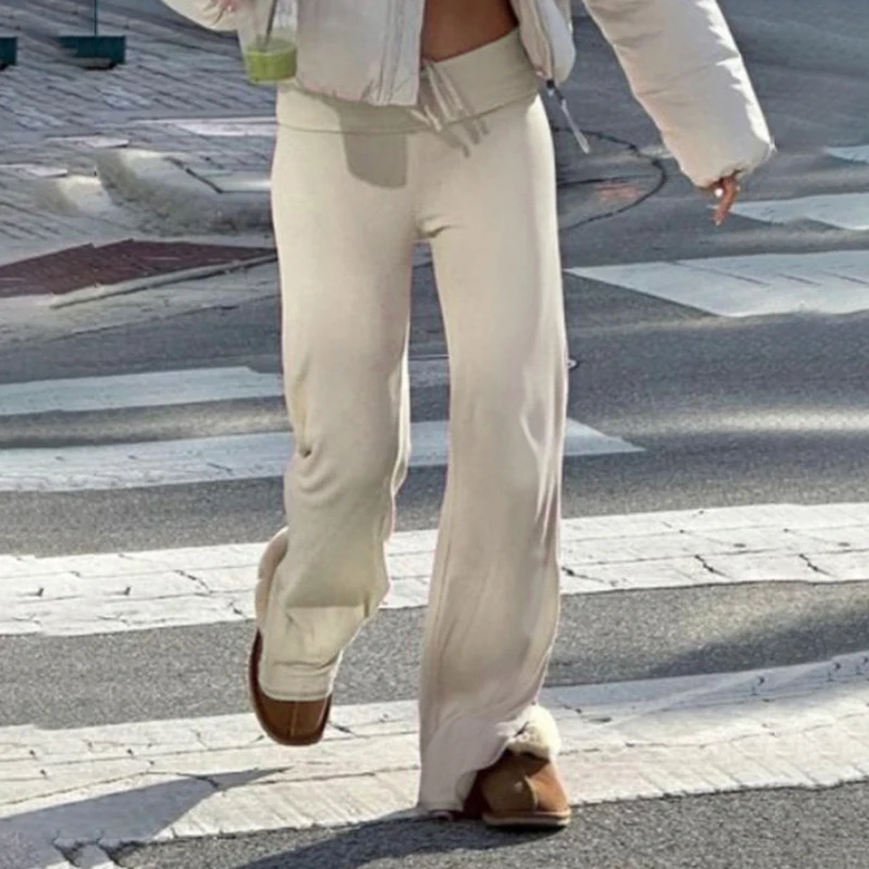 TAVIMART - Drawstring Solid Women Slacks Turndown Waist Straight Casual Pants Concise Knitted Sweatpants All-matched Trousers Home