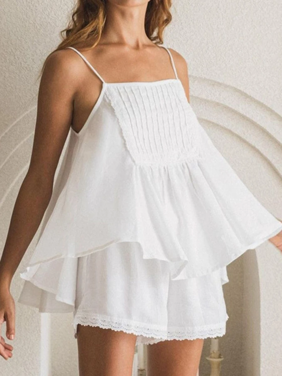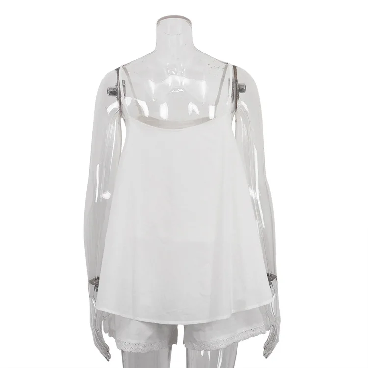 TAVIMART - White Lace Trim Shorts Two-piece Set Women Summer Sleeveless Loose Tank Top+Elastic Waist Shorts Simple Casual Home Cozy Sets