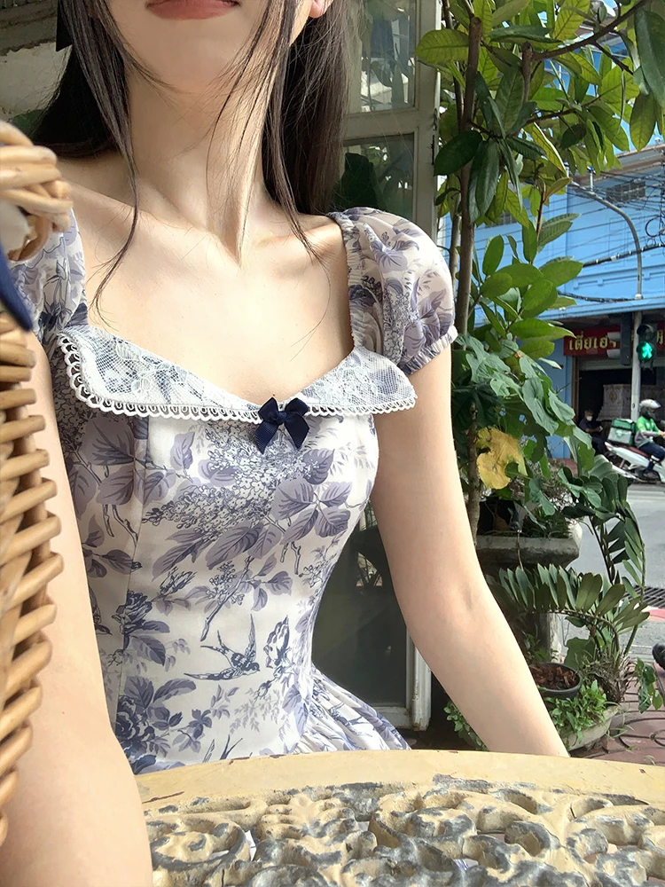 Retro Floral Lace Midi Dress Woman Summer Short Sleeve Elegant Dress Women Even Party One Piece Dress Korean Fashion Chic