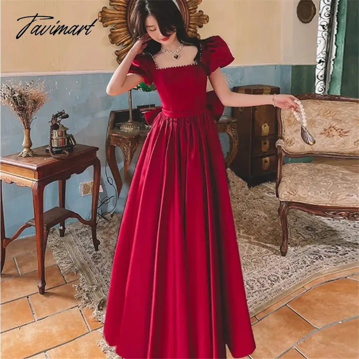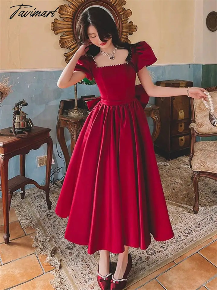 Solid Color Dress for Women Spring Summer New Beaded Bow Square Collar Short Sleeve Mid-length A-line Skirt Female Clothing M240