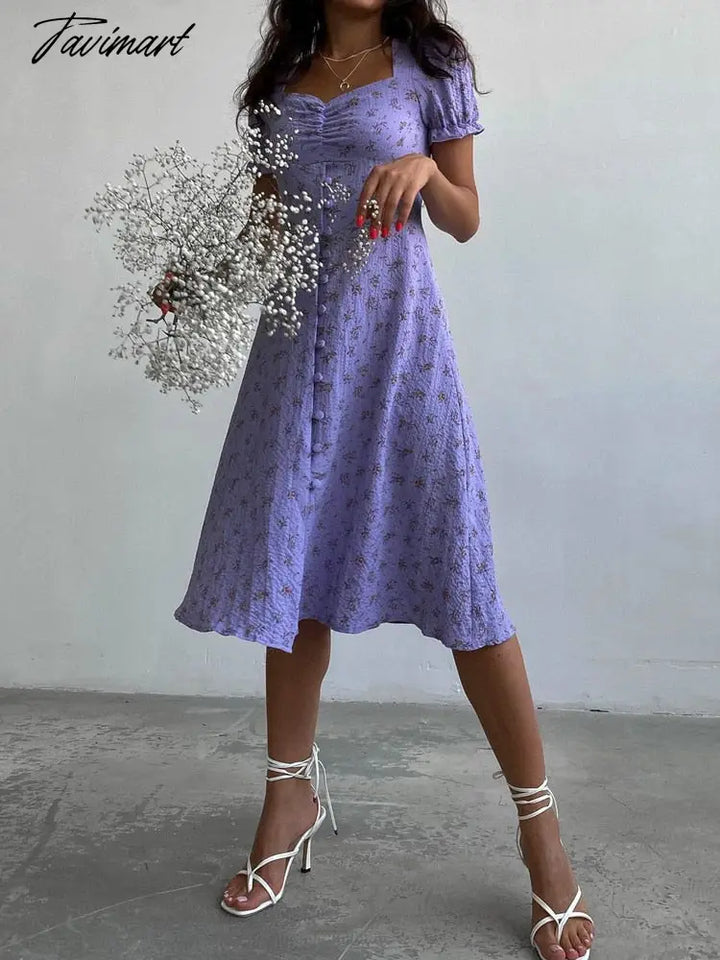 Tavimart Dresses Floral Print Bubble Short Sleeve Vintage Print Women's Dress Square Neck A-Line Long Summer Dress Boho Festive Dres
