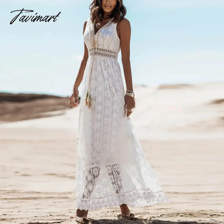Tavimart New Arrival Summer Boho Long Dresses Women Lace V Neck Spaghetti Strap Dress Lady Off Shoulder Beach Sundress White Dress