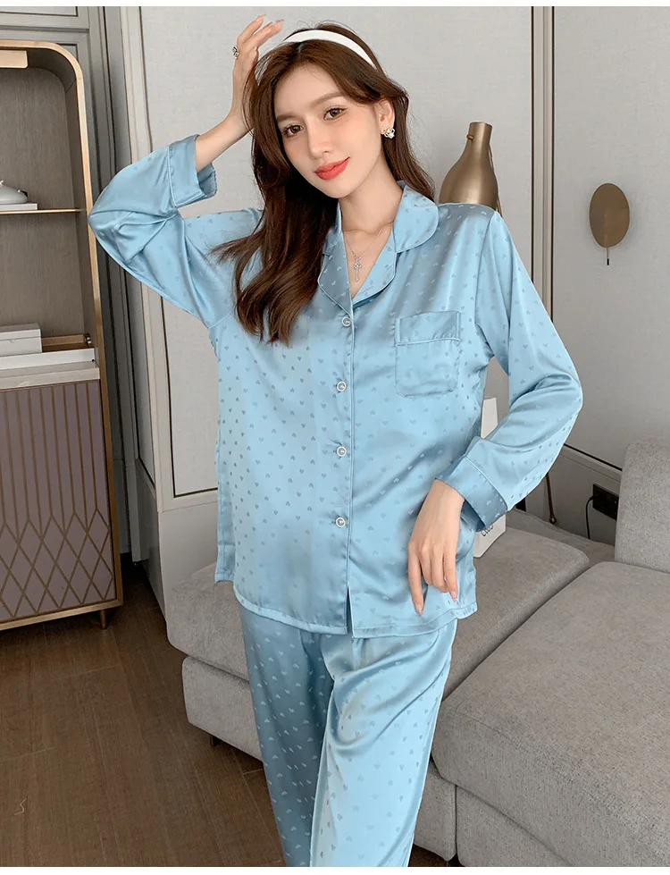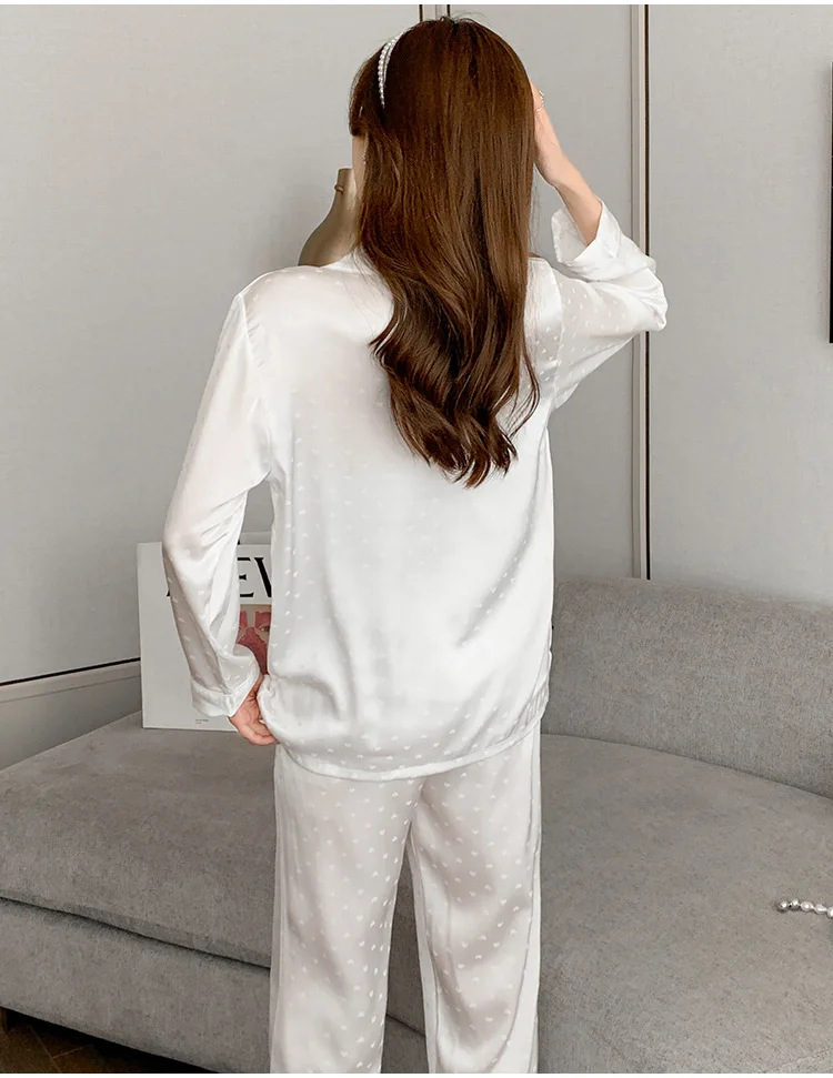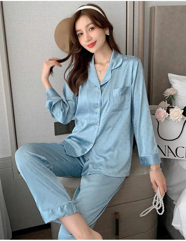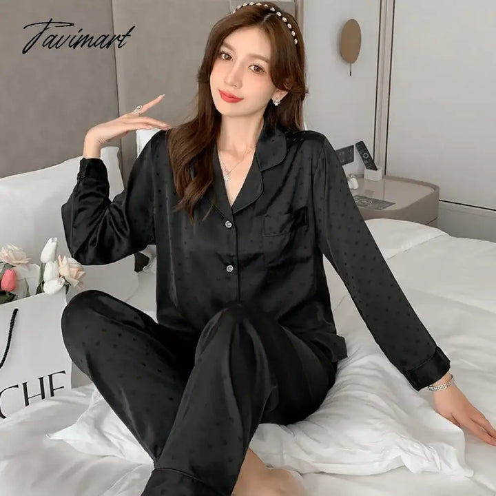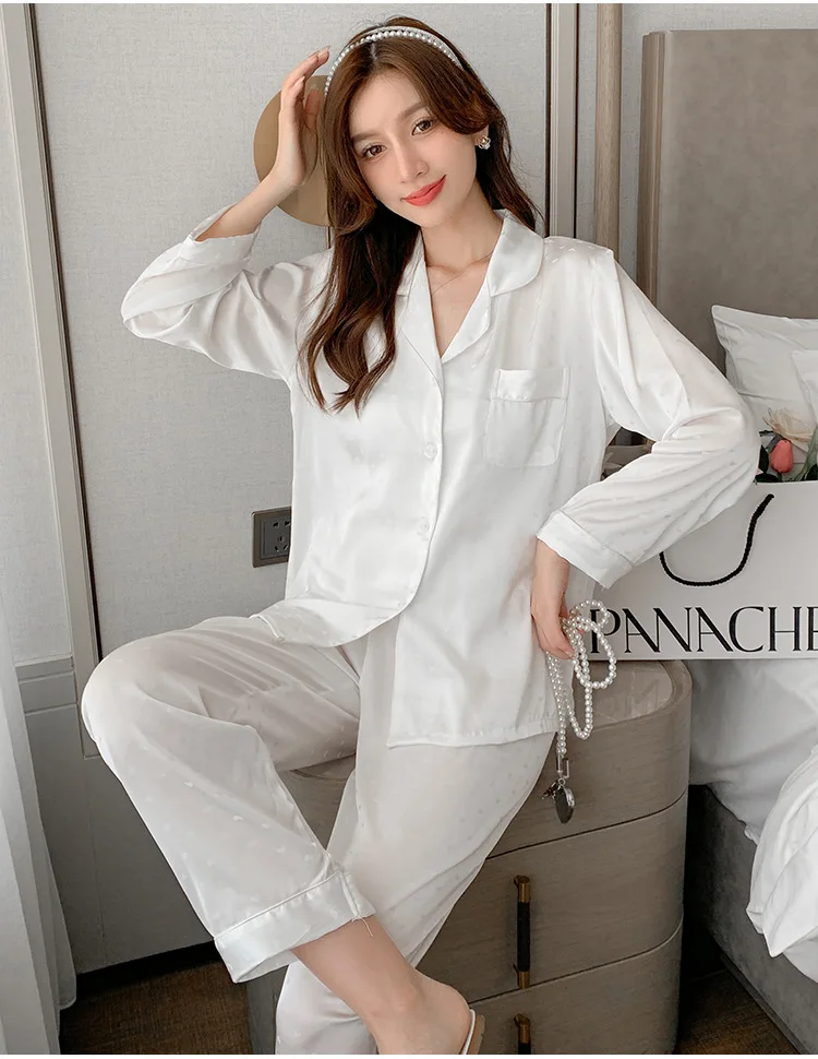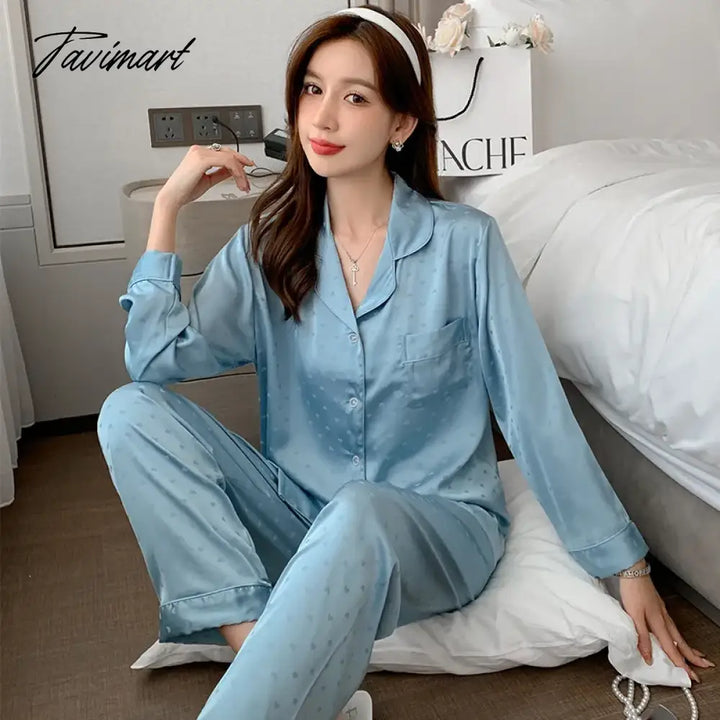 Tavimart Autumn ice silk jacquard long sleeve pants thin pajamas women solid color casual sexy cardigan pocket suit home clothing women