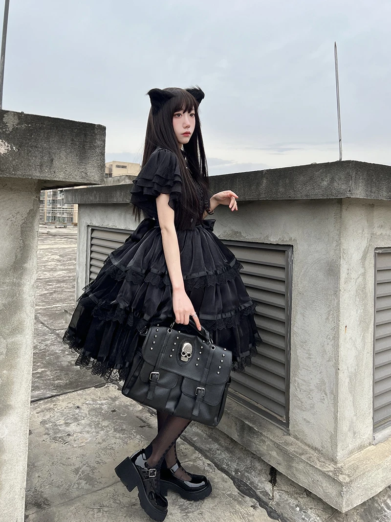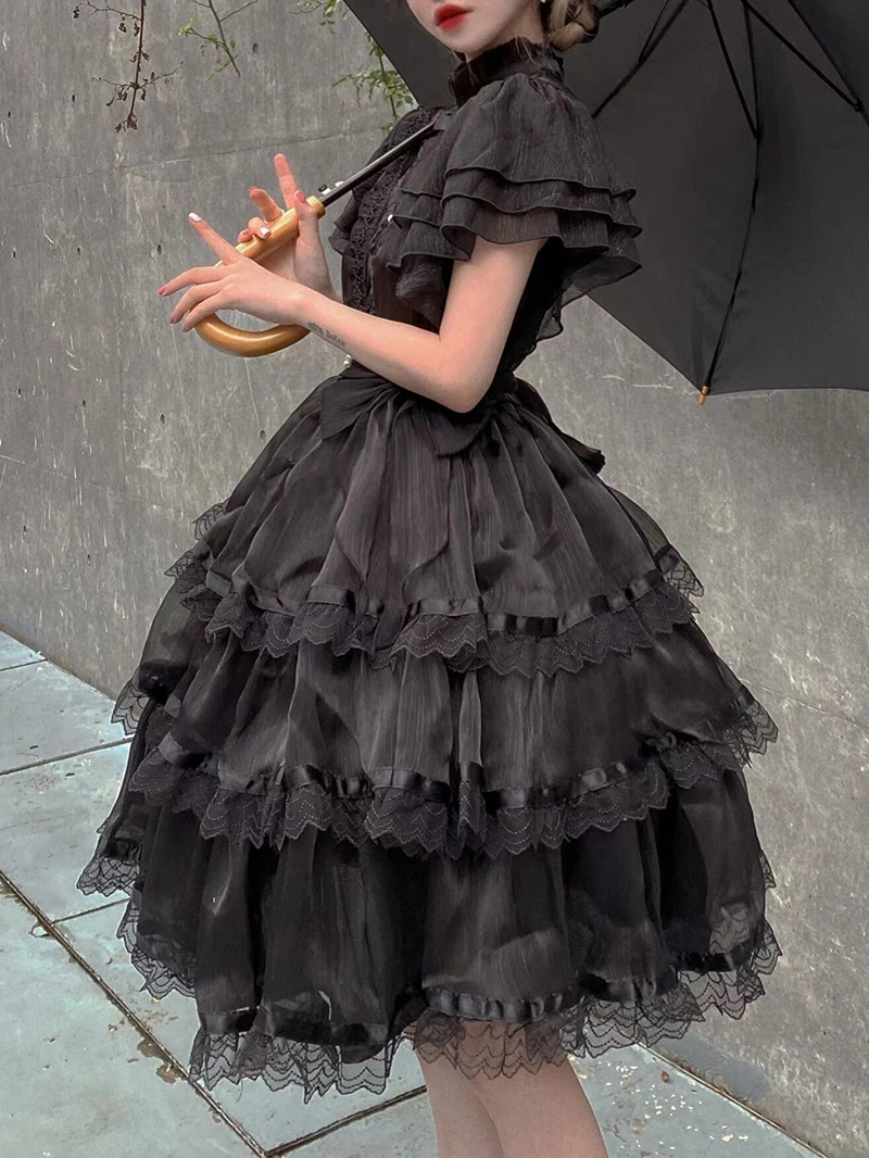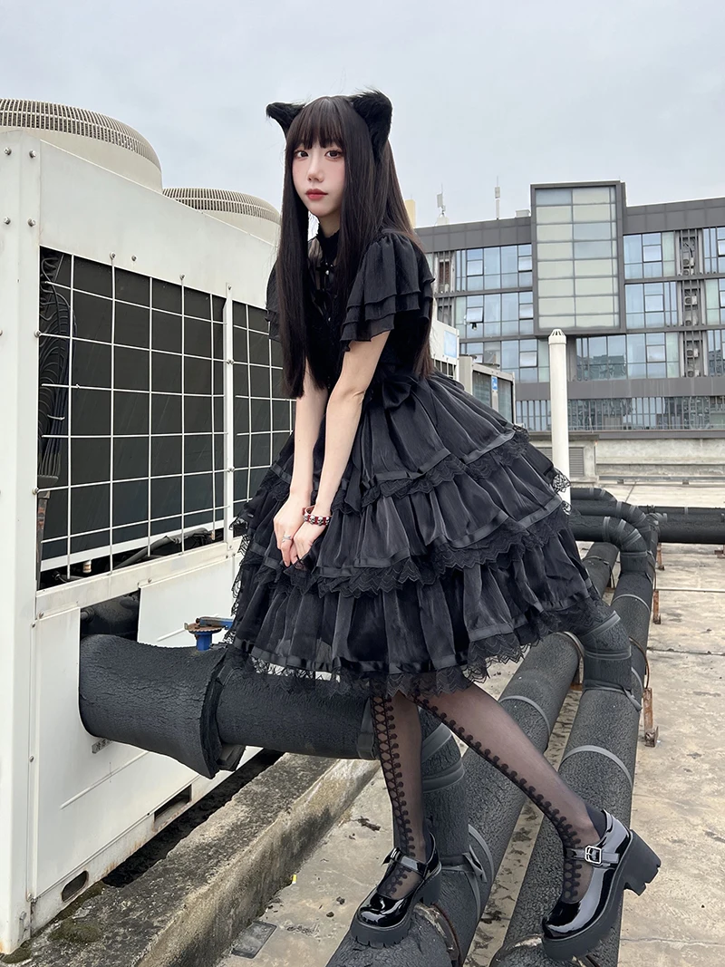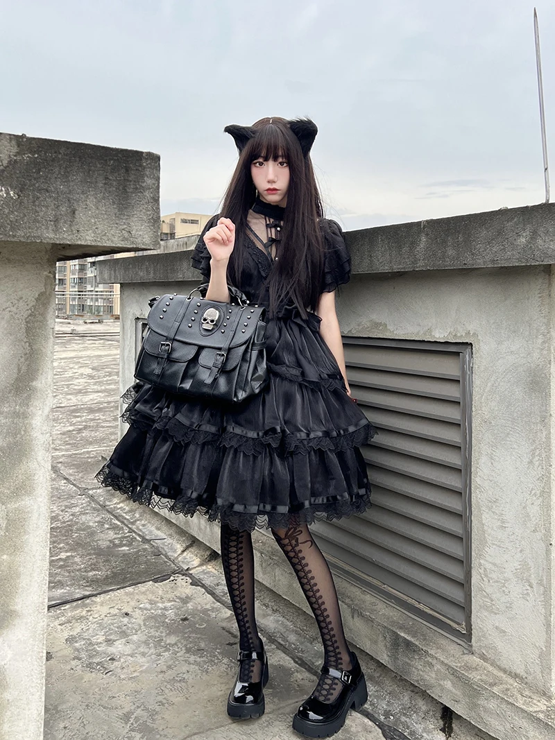Tavimart Balck White Angelic Pretty Lolita Op Dark Gothic Girl Dress Flower Wedding Daily Short Sleeve Op Fluffy Vestido Tea Party