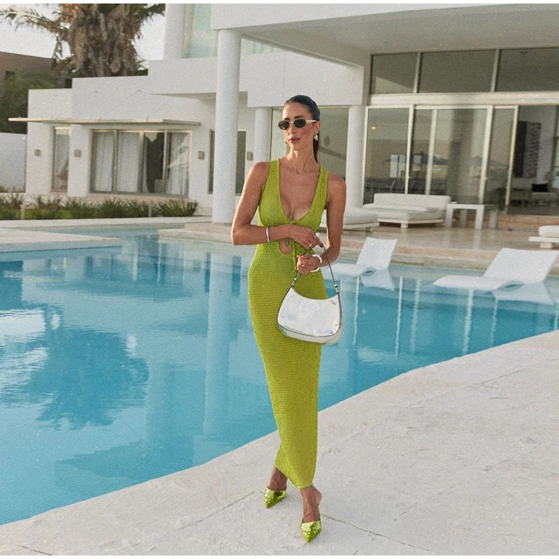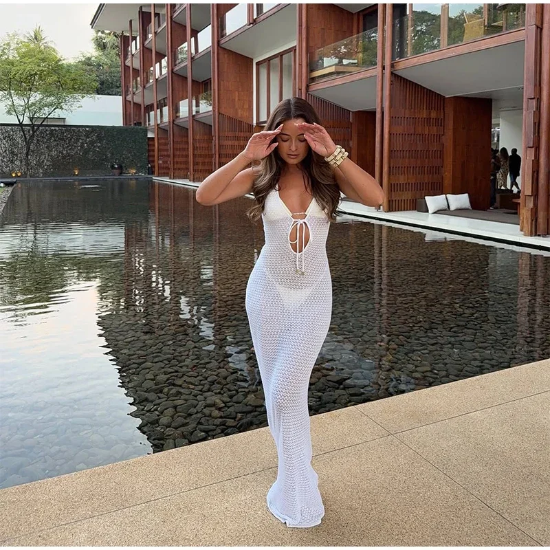 TAVIMART - Beach Hollow Out Knit Long Dress Women Slim Sleeveless Lace Up V-neck Bodycon Dresses Female 2025 Summer Party Solid Robes