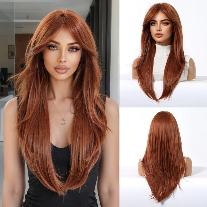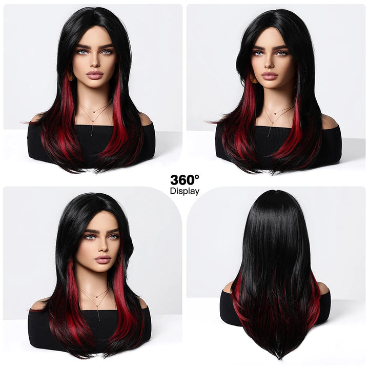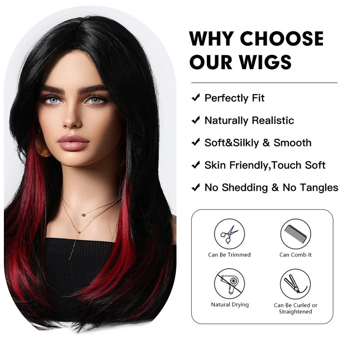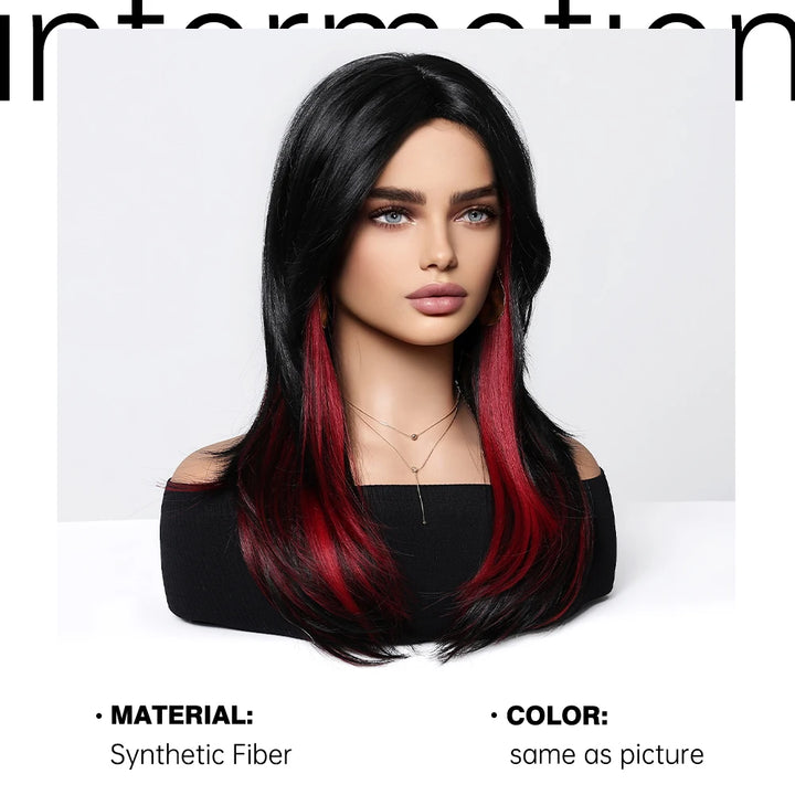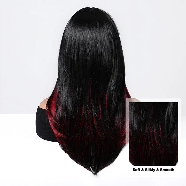 TAVIMART - Black Highlight Rose Red Wig With Curtain Bangs 18inch Natural Layered Straight Synthetic Wig For Women Christmas Party Cosplay