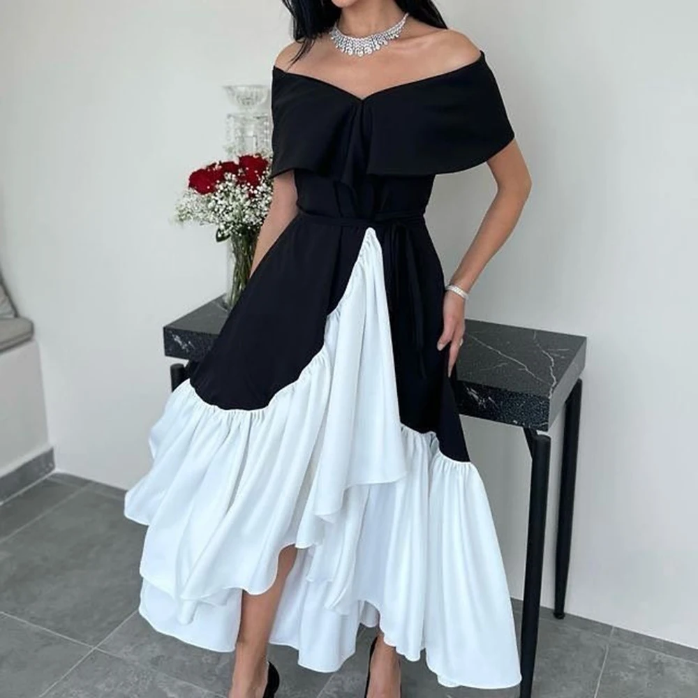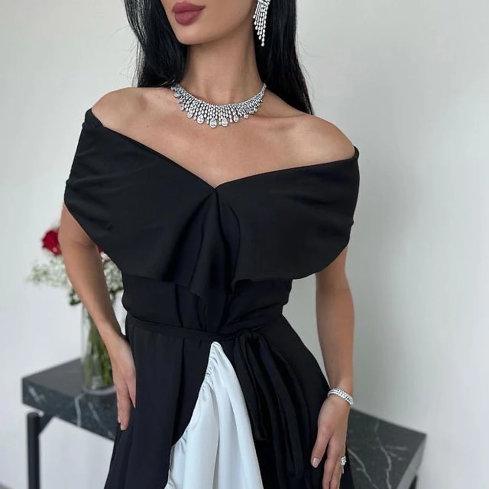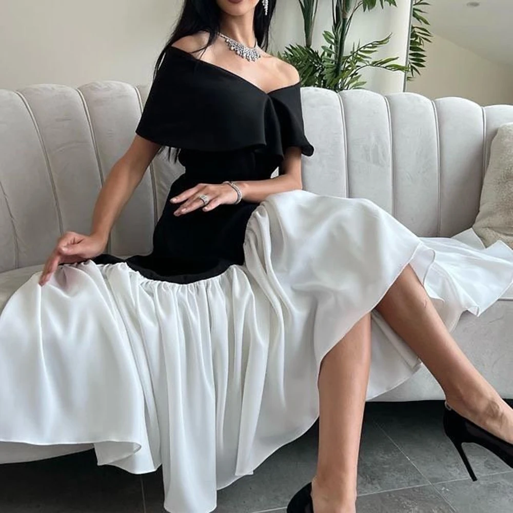 TAVIMART - Black White Arabic Prom Dresses Off The Shoulder Satin Formal Dress Outfits Evening Party Gowns Women Wedding Wear