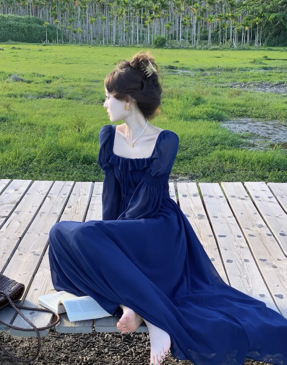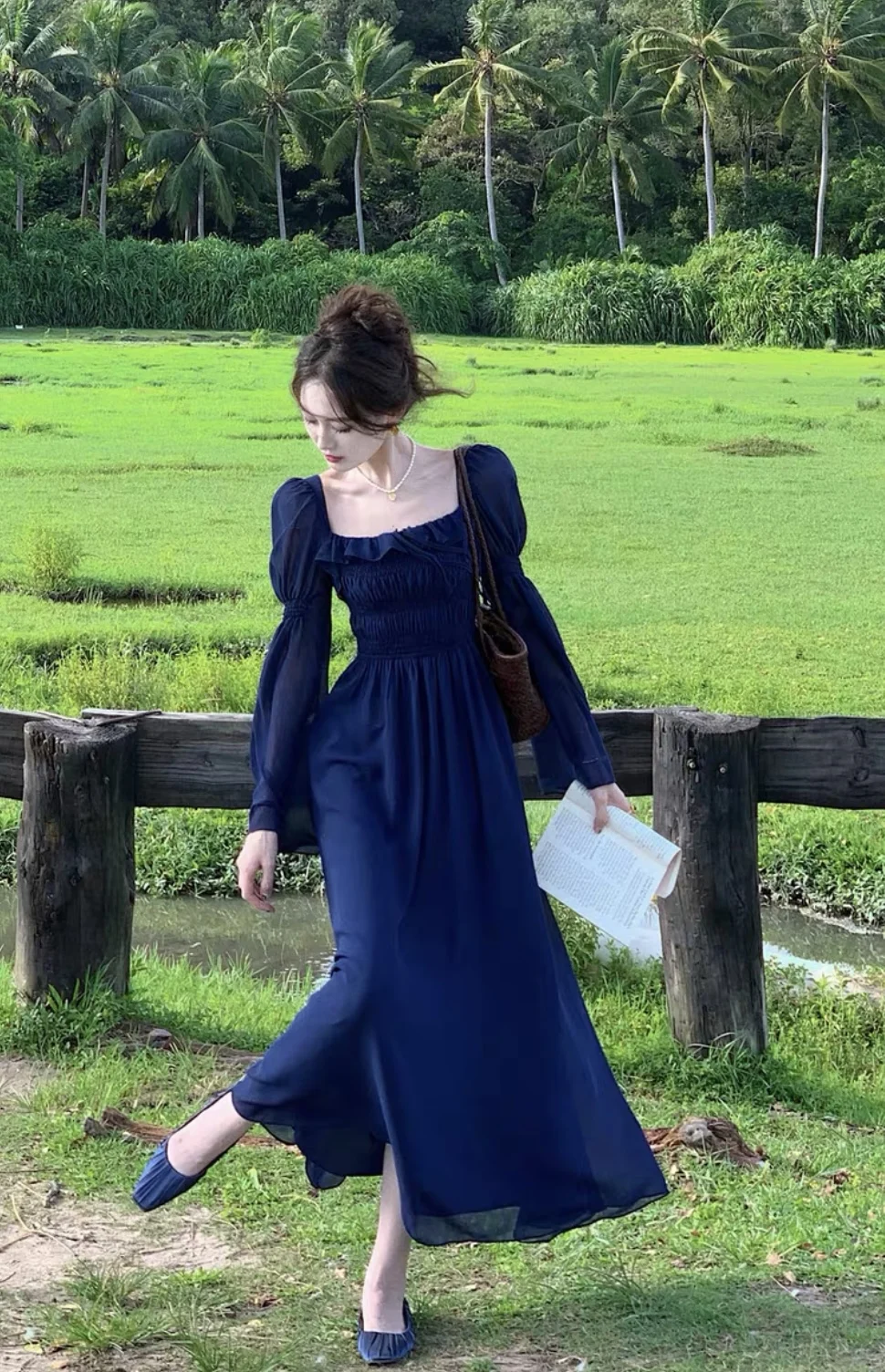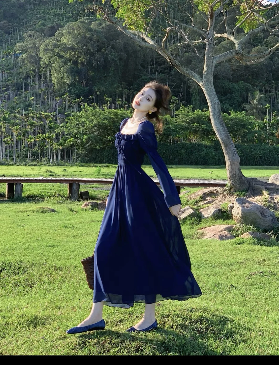 TAVIMART Blue Square Neck Lantern Sleeve Dress Women Autumn Sweet Retro Elegant High Waist Ruffles Pleated Party Sundress Simple Fashion