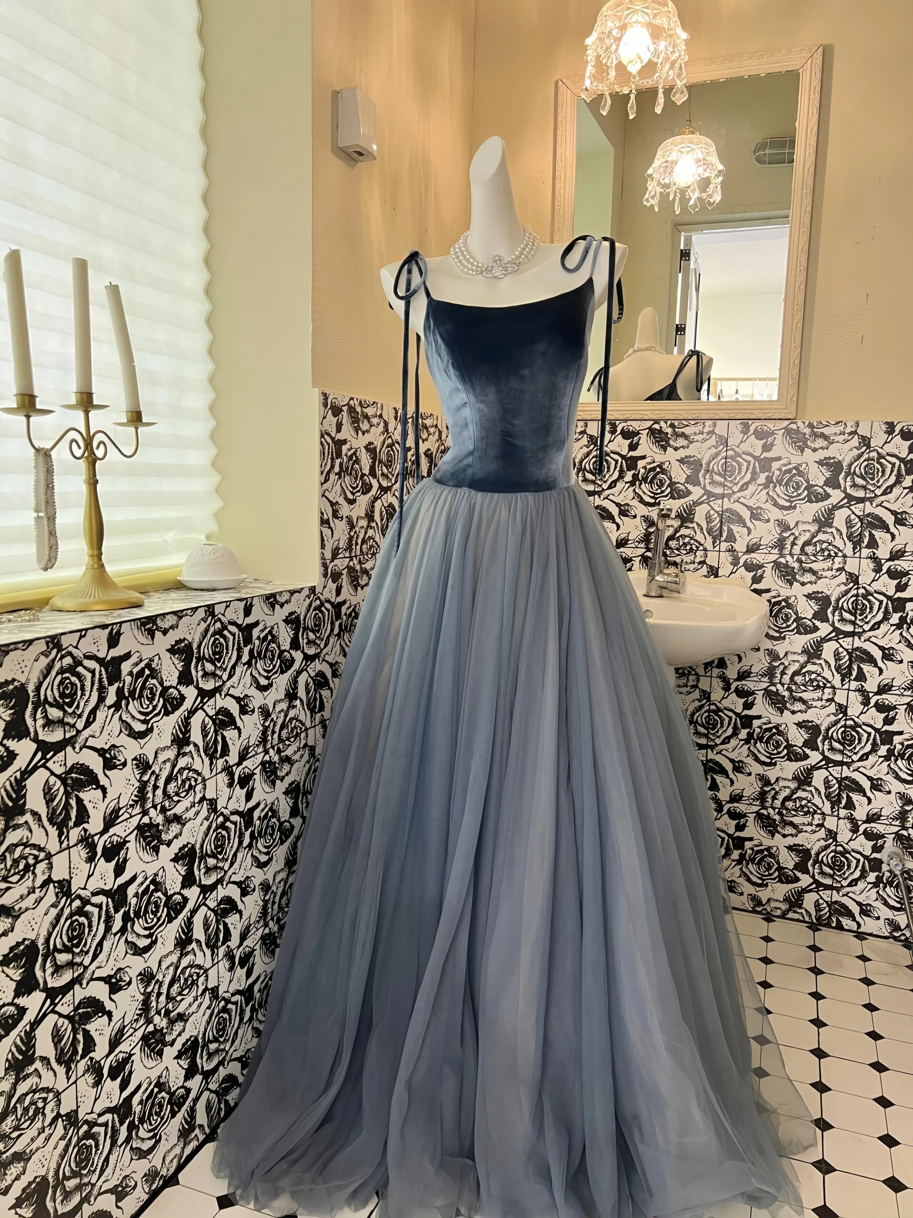 TAVIMART - Blue Velvet Evening Dress Boat Neckline Spaghetti Straps Sleeveless Backless Special Occasion Wedding Ball Dress