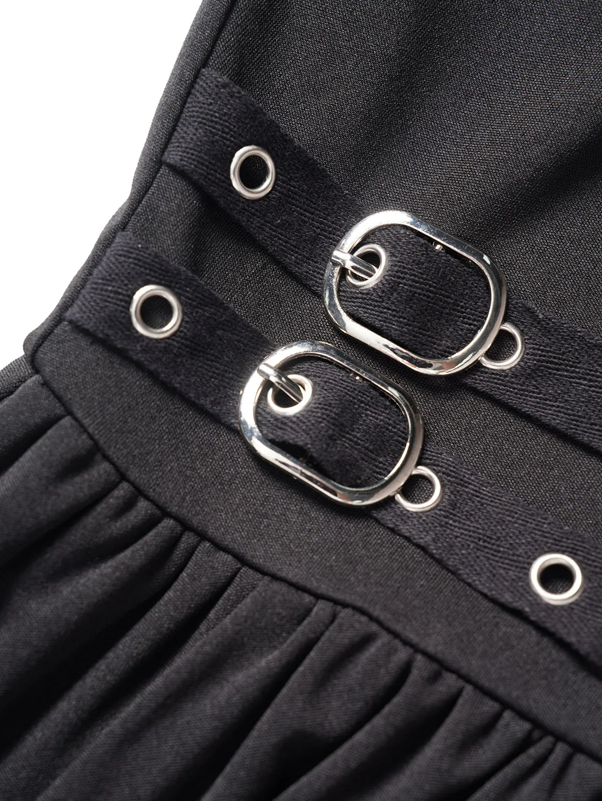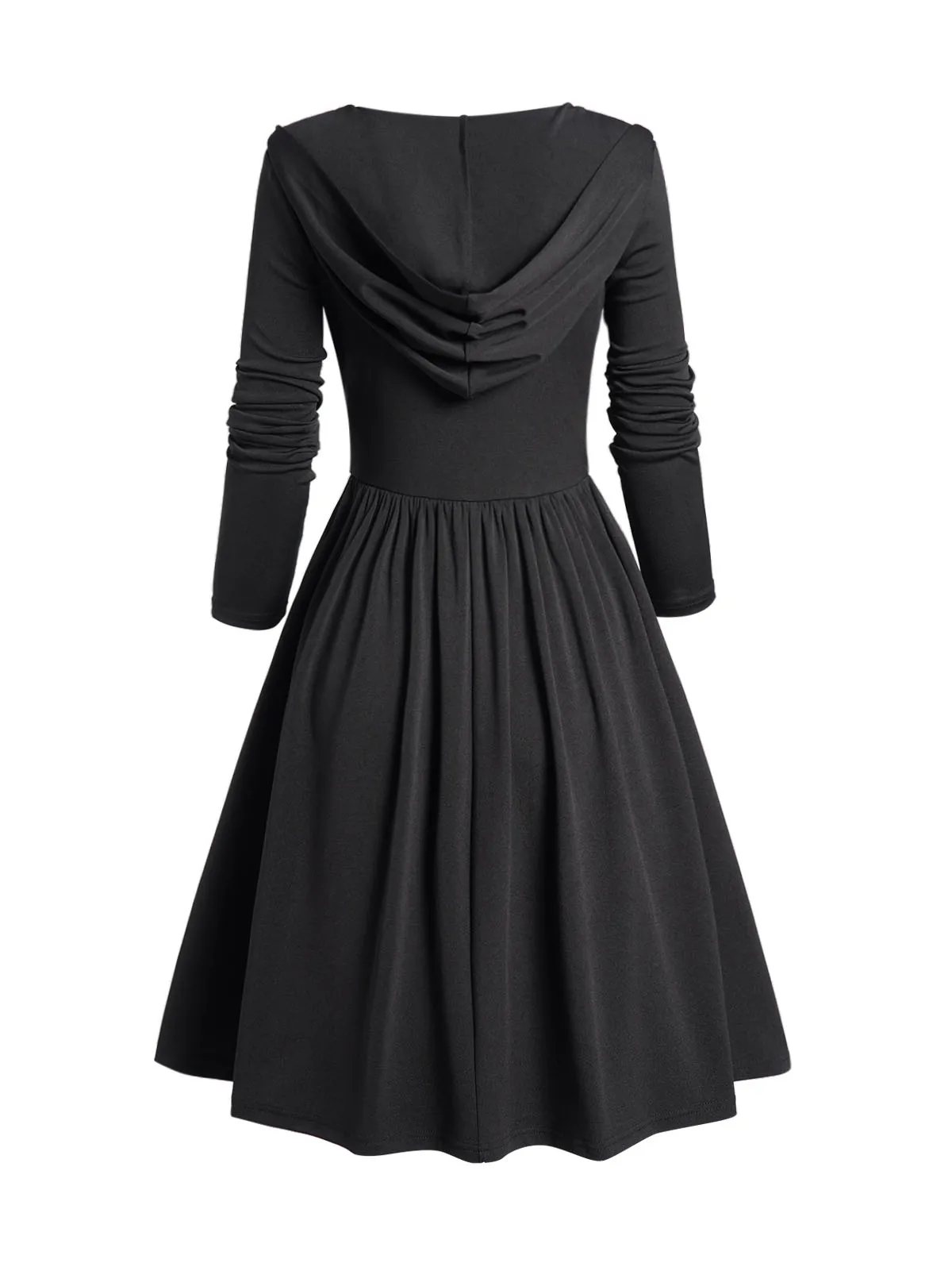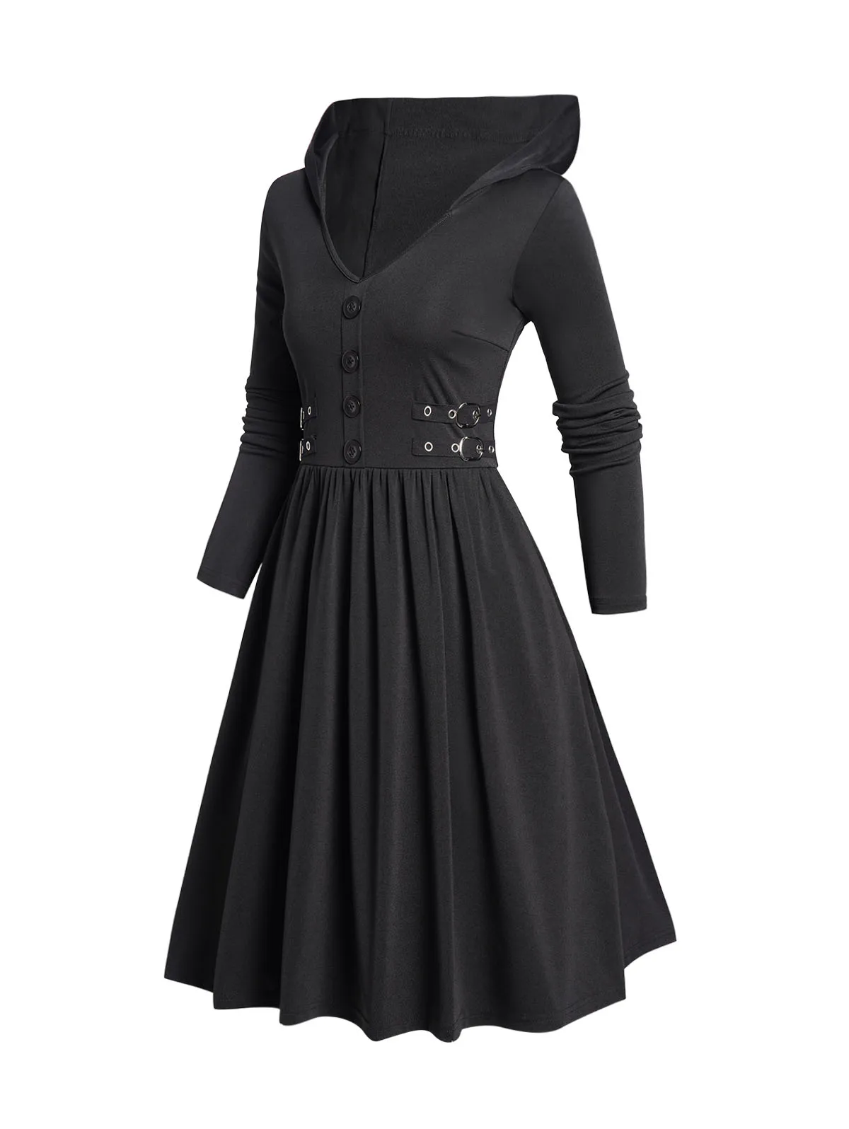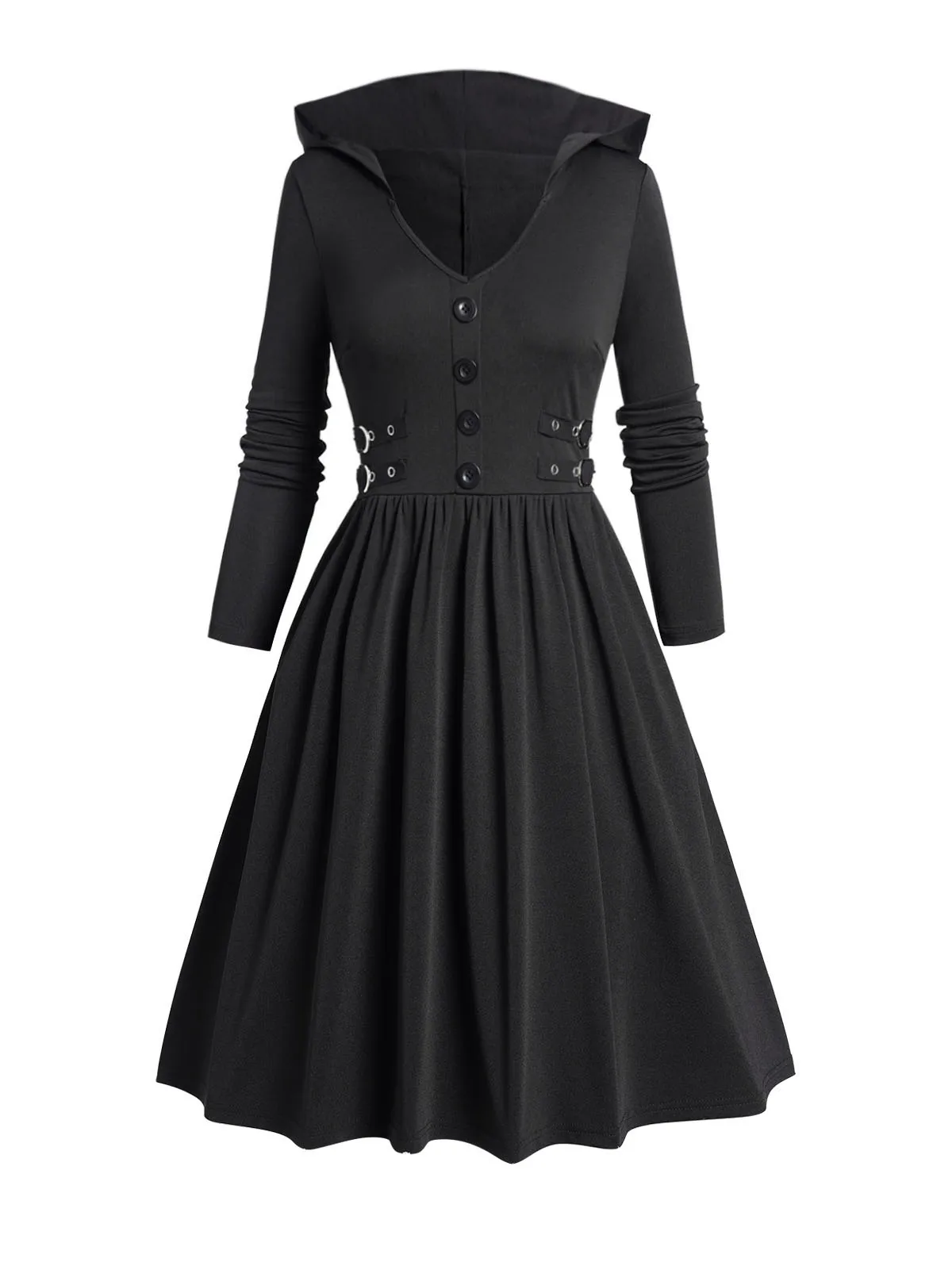 TAVIMART - Buckle Gothic Hooded Dress Plain Color Long Sleeve A Line Casual Dress Spring Fall Black Dresses For Women 2024 New
