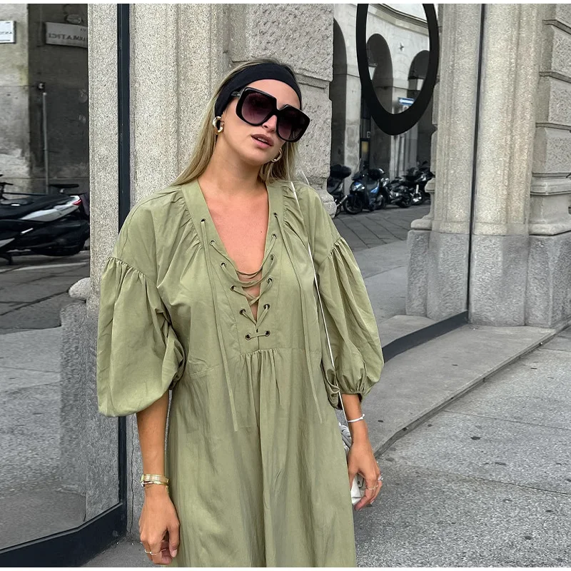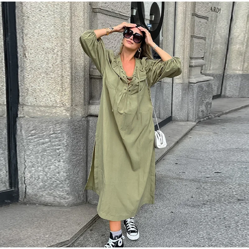 TAVIMART - Casual Street Lace Up Long Dresses Women New Chic Loose V-neck Side Slit Solid Dress Female Summer Versatiel Street Party Robes