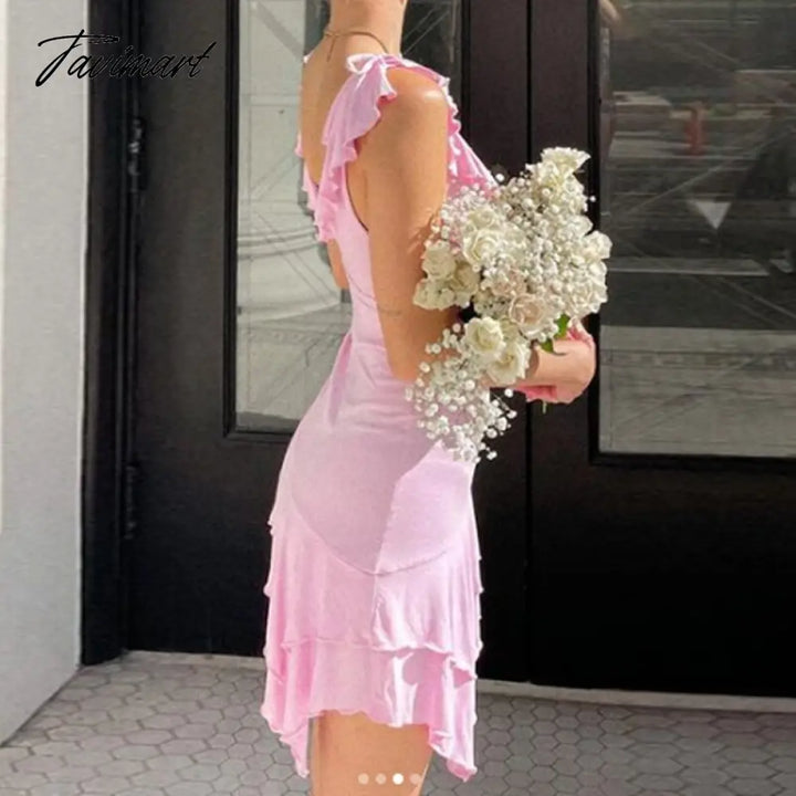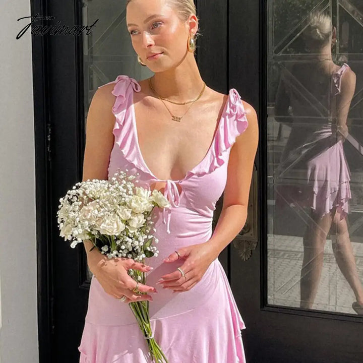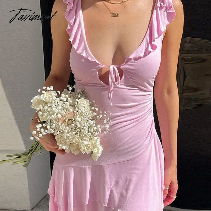 Tavimart Chic Women Pink Mini Dress Front Tie Up Hollow Out Ruffles V Neck Sleeveless A-line Dress Y2K Fairycore Streetwear