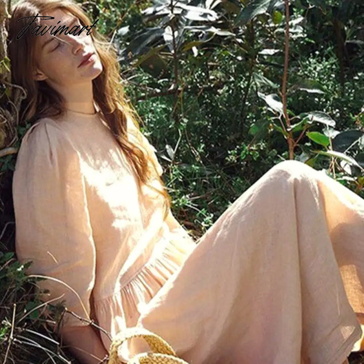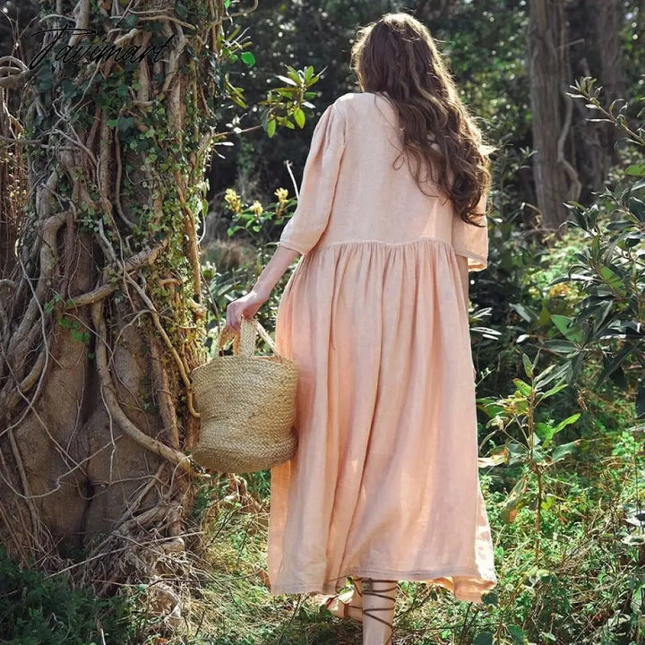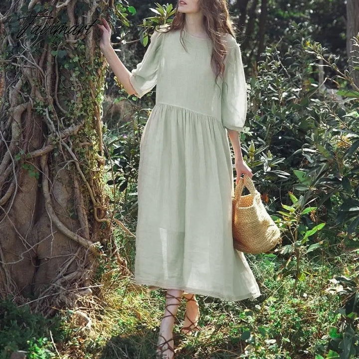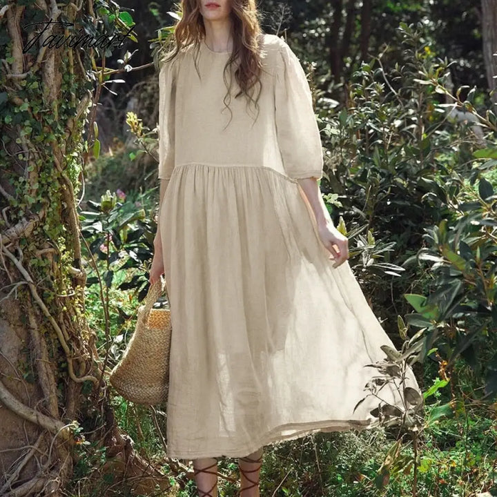 Tavimart Cotton Linen Elegant Dresses For Women Casual Loose O-Neck Three Quarter Sleeve Long Maxi Party Dress Robe Femme éTé