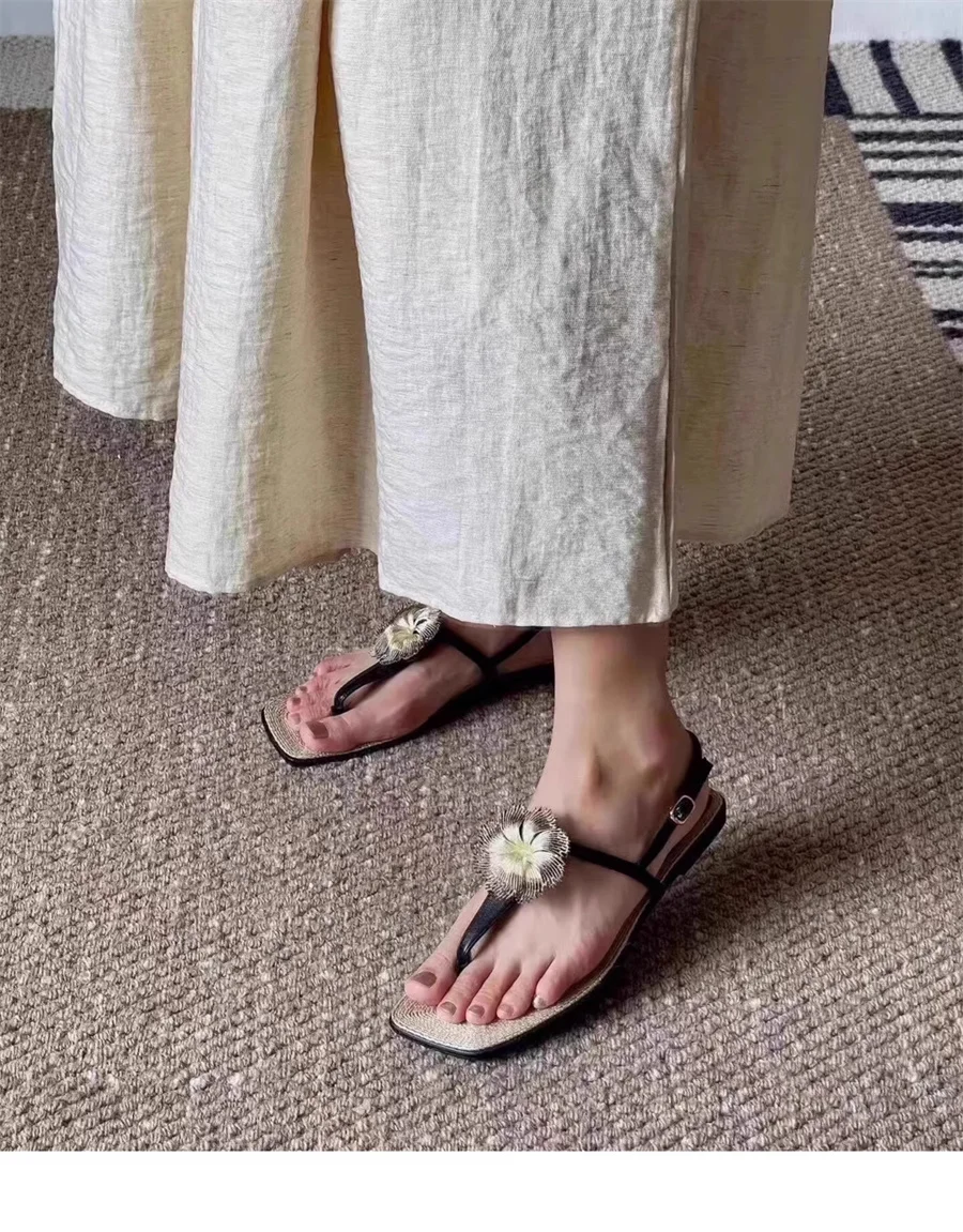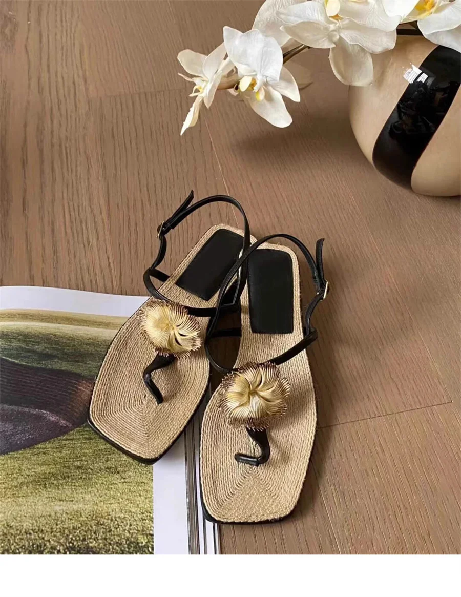 TAVIMART - Designer Summer Sandals Fashion Straw Flip Flops Square Toe Beach Shoes Woman Bohemia Vocation Flats Holiday Casual Slides