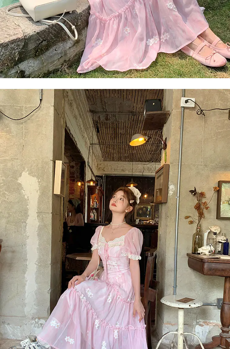 TAVIMART - Dress With Lace Embroidery Flowers Pink Gentle And Sweet French Romantic Super Fairy Puff Sleeve Long Dress Large Size Summer