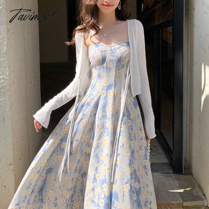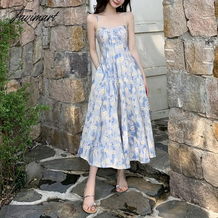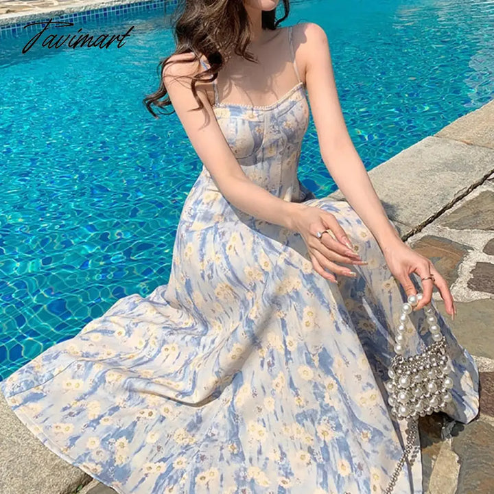 Tavimart Dress Women's Summer New French Style Fairy Temperamental Strap Artistic Floral Oil Painting Dress