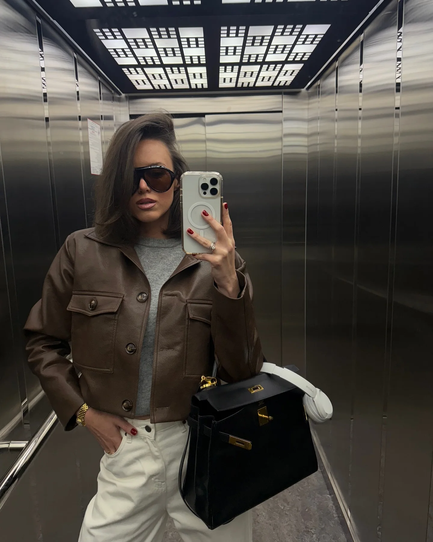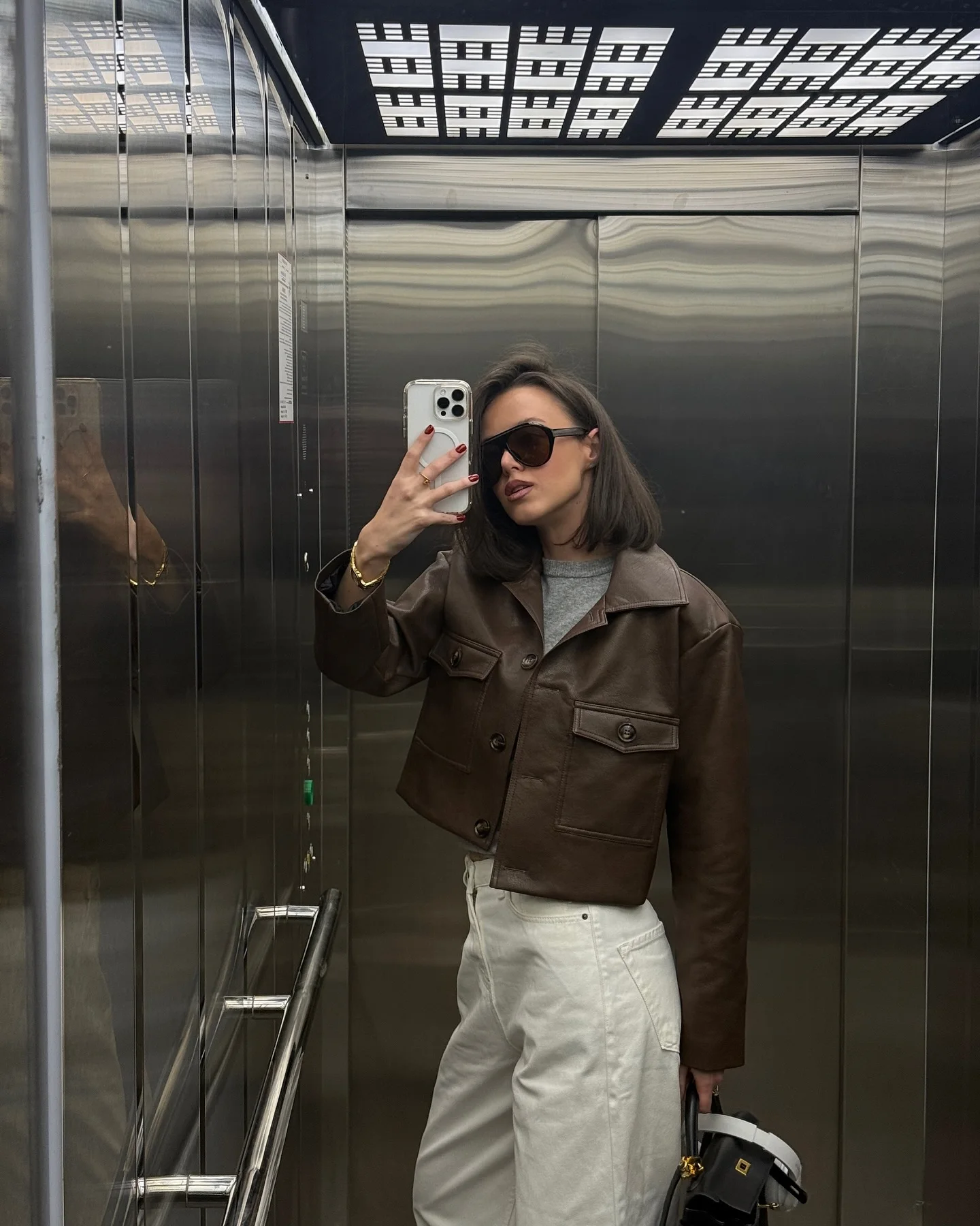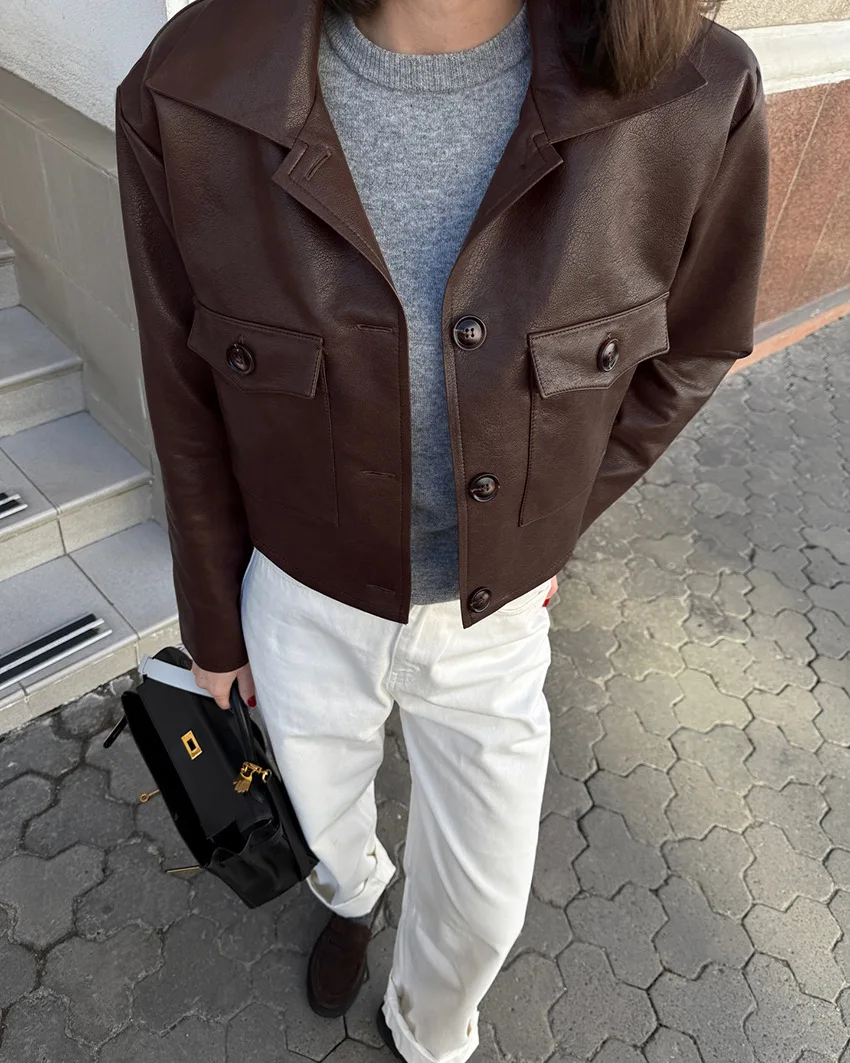 TAVIMART - Elegant Brown Leather Cropped Jacket Women Fashion Laple Single Breasted Long Sleeves Coats Autumn Lady High Street Outwears