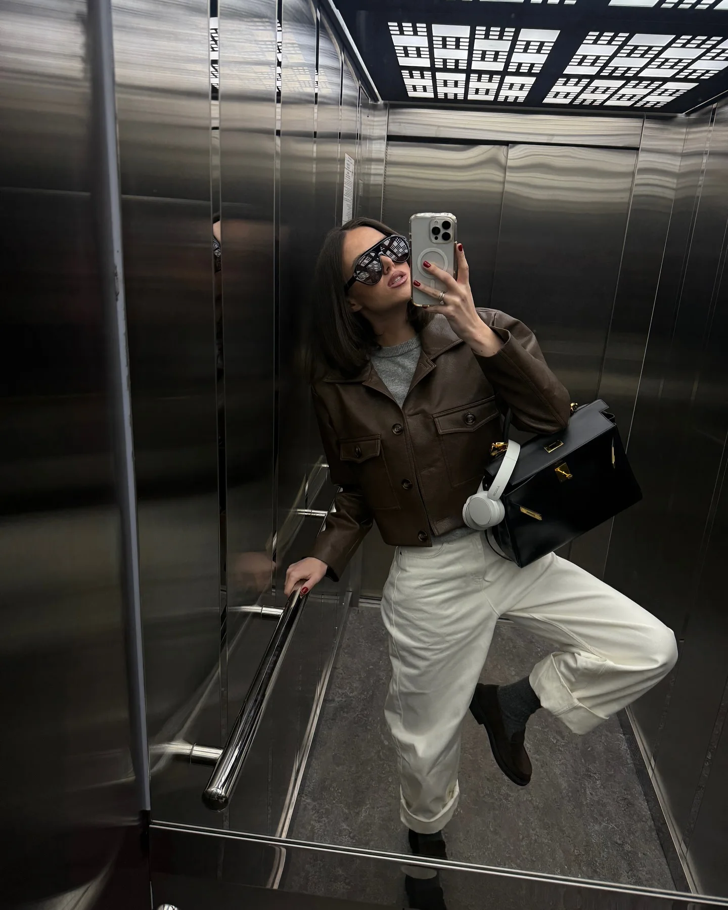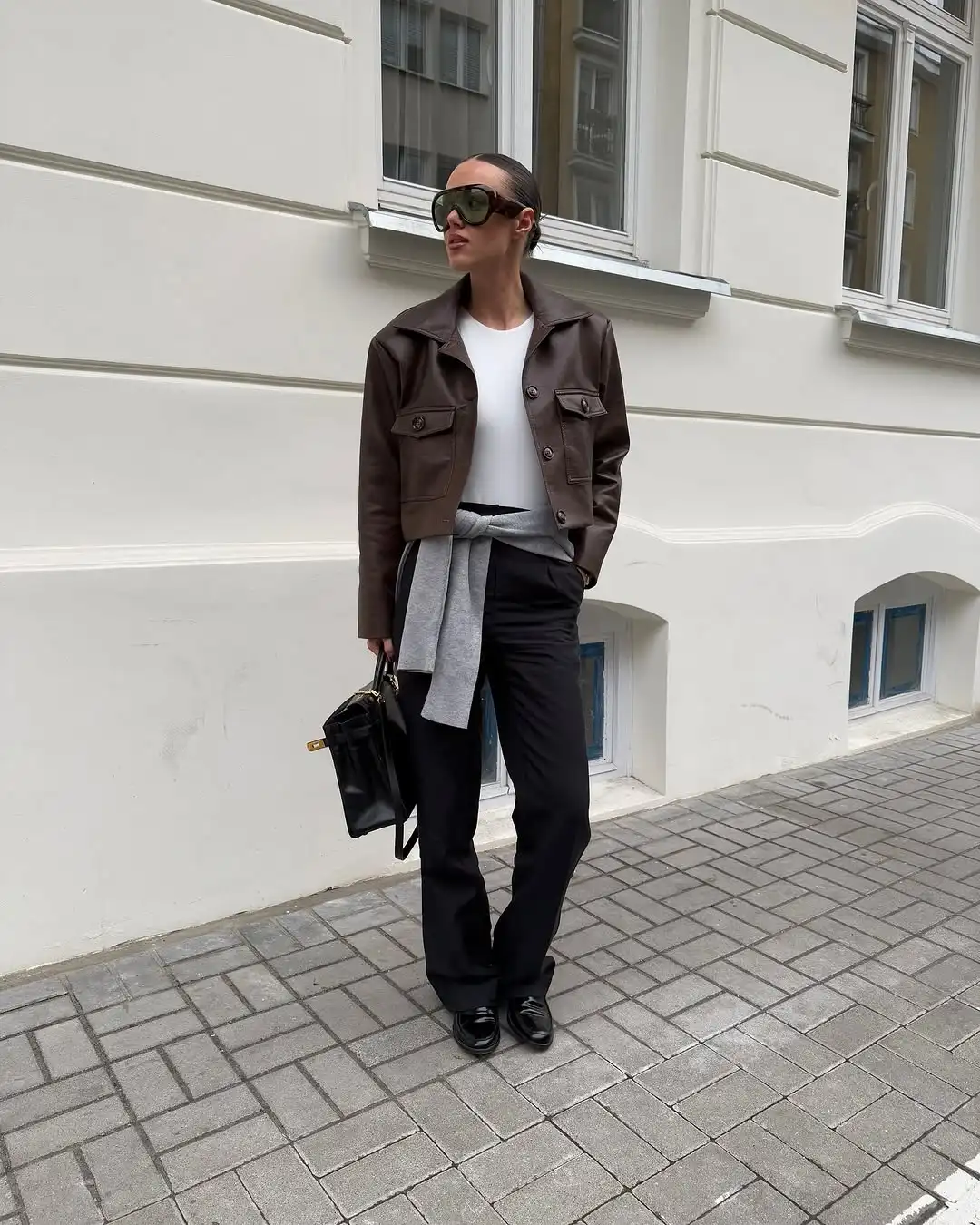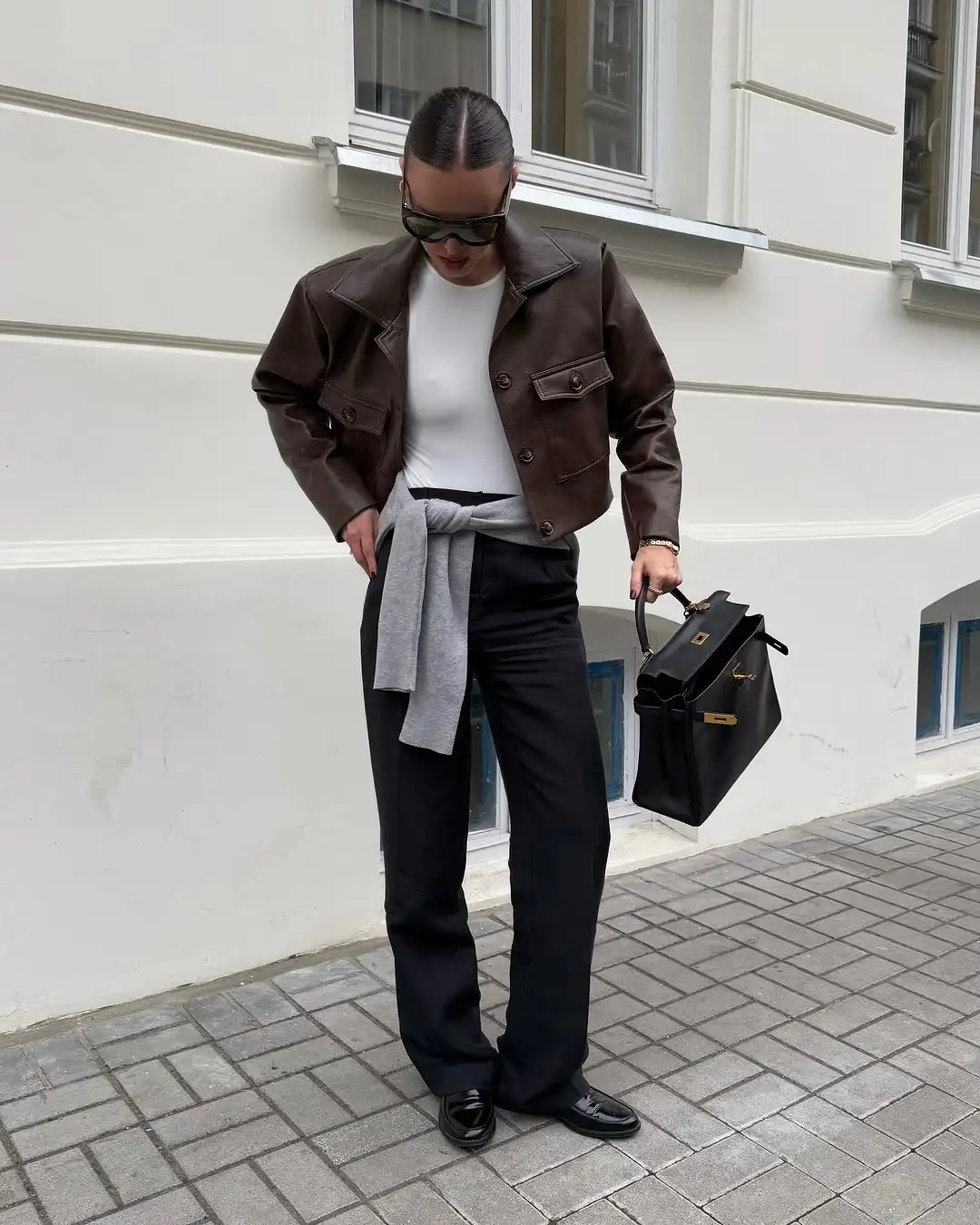 TAVIMART - Elegant Brown Leather Cropped Jacket Women Fashion Laple Single Breasted Long Sleeves Coats Autumn Lady High Street Outwears