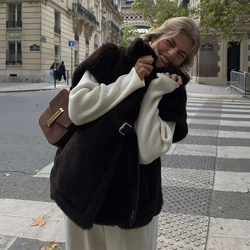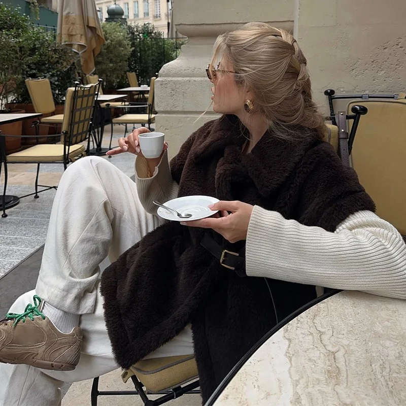 TAVIMART - Elegant Faux Fur Solid Shawl Women Coat Leather Buckle Lapel Loose Female Jacket Autumn Winter Thick Warm Cape Lady Outwear