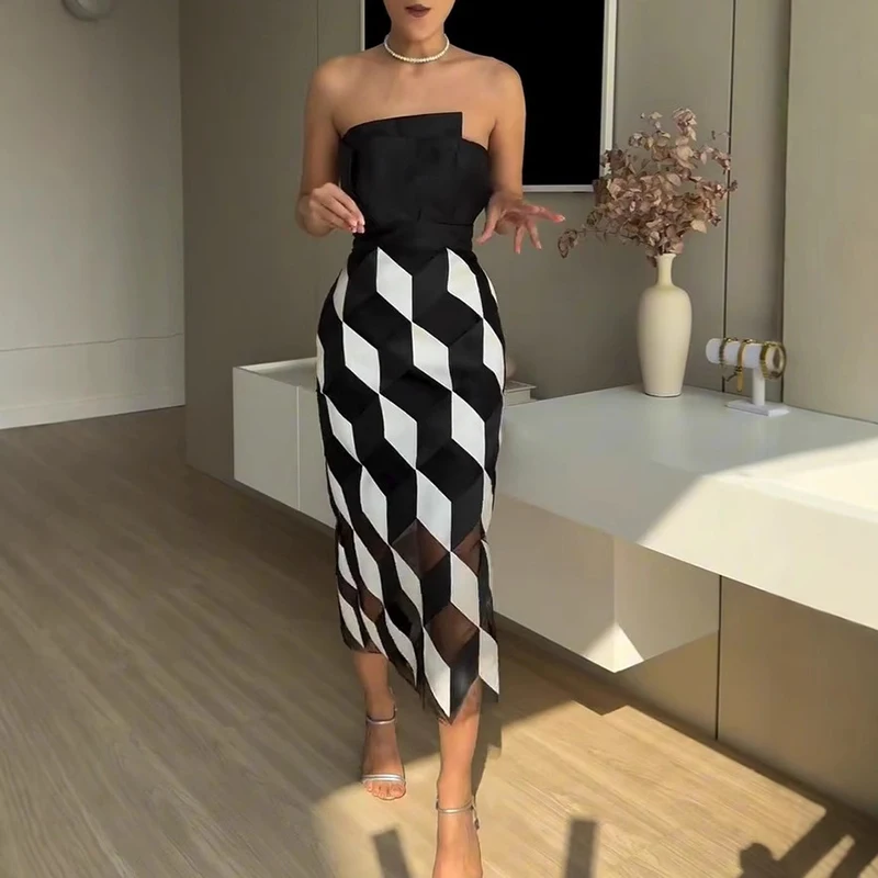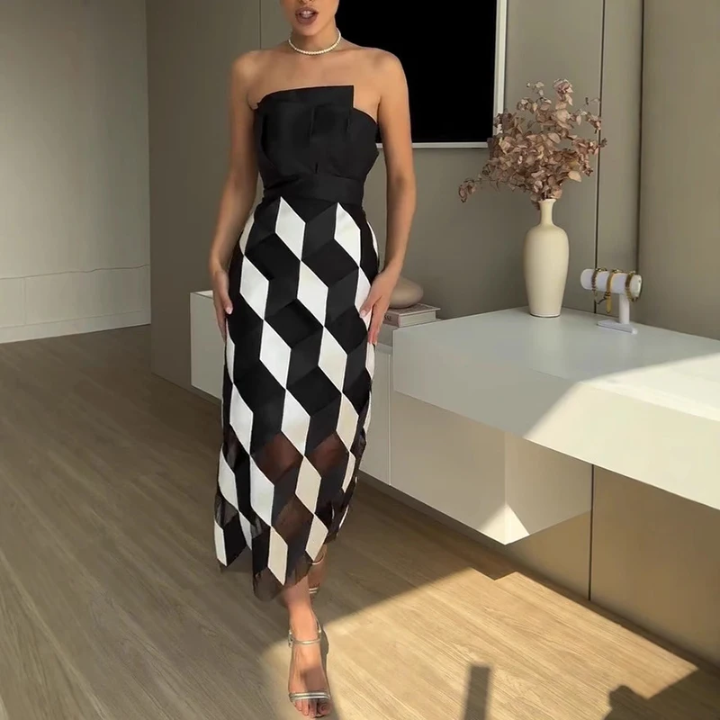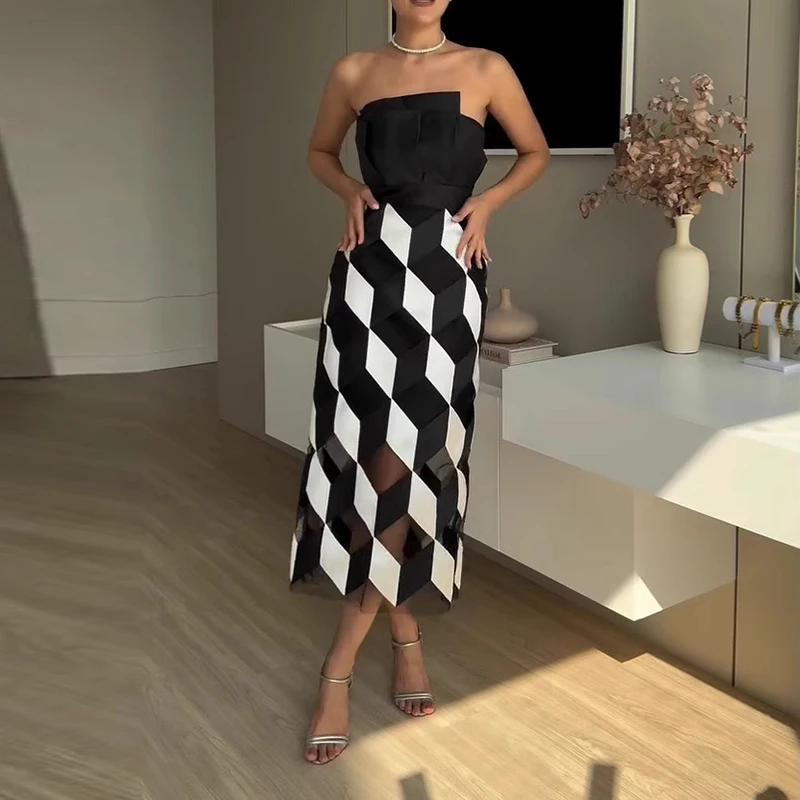 TAVIMART - Elegant Female Lattice Tube Tops Party Dress Sexy Waisted Slim Banquet Long Dress Women Luxury Contract Color Formal Dress