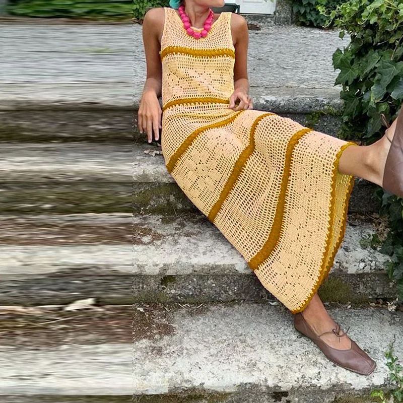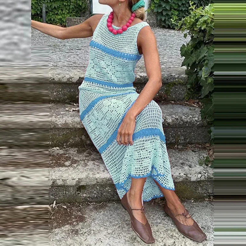 TAVIMART - Elegant O-neck Clashing Knitted Vest Dress 2025 Summer Casual Sleeveless Loose Party Dress Fashion Hollow Out Beach Long Dress