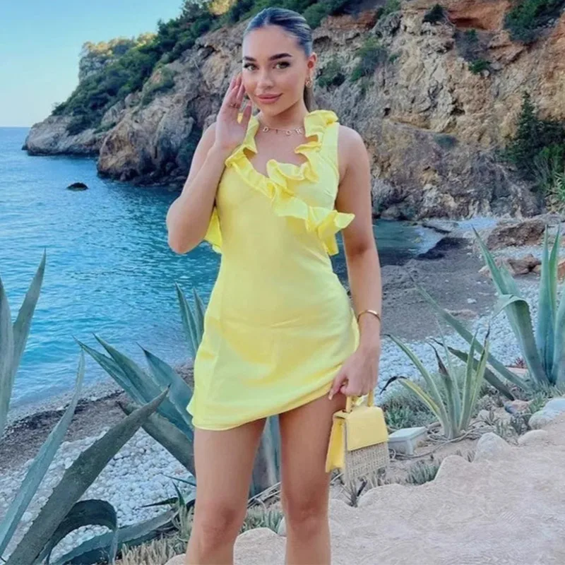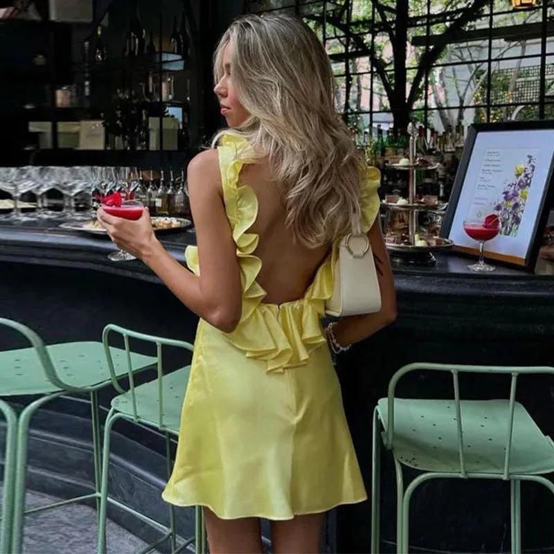 TAVIMART - Elegant Ruffle Dress Women Sling Sleeveless Backless A-line Mini Dresses Female 2025 Spring Summer Chic Casual Yellow Lady Robe