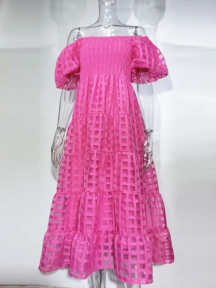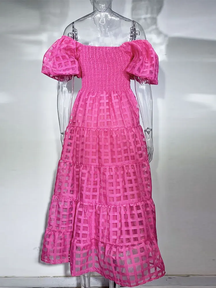 Tavimart Elegant Solid Color One-shoulder Bubble Sleeve Tie Waist Dress Women Summer Beach Wear Sexy Hollow Out Maxi Dresses A2654