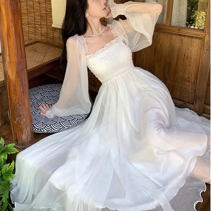 Tavimart Elegant White Dress Women Sexy Off Shoulder Long Dress Fashion Puff Sleeve Elastic High Waist Dress Lady Casual Party Gown Dress