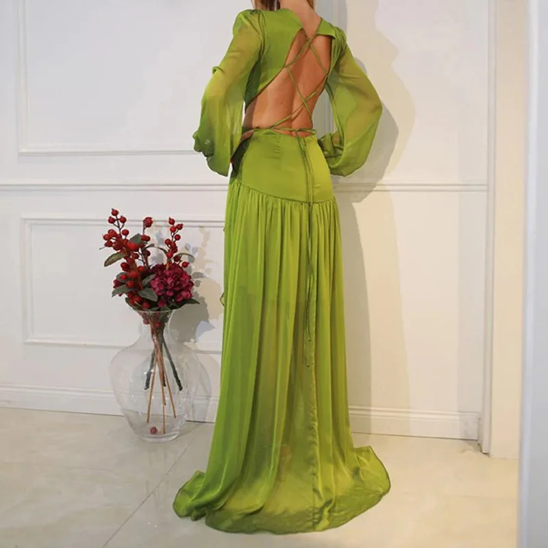 Tavimart Fashion Long Sleeve Deep V-neck Hollow Beach Dress Women Sexy Backless Tie-up Ruffle Dress Ladies Casual Solid Loose Dresses New