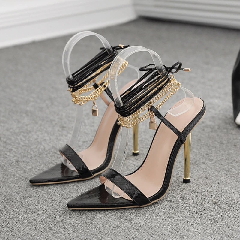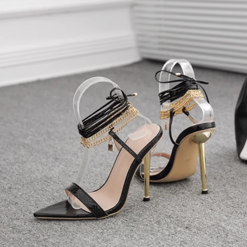 TAVIMART - Fashion Metal Chain Design Women's High Heels 12CM Summer New Gold Ankle Strap Sandals Pointed Toe Elegant Party Stripper Shoes