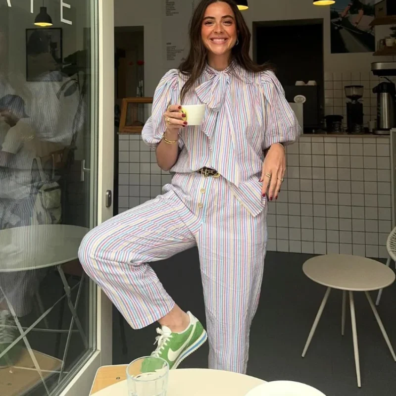 TAVIMART - Fashion Stripe Print Bow Lace Up Puff Half Sleeve Shirt Sets Women Loose Button Wide Leg Pants Suits 2024 Lady Chic Streetwear