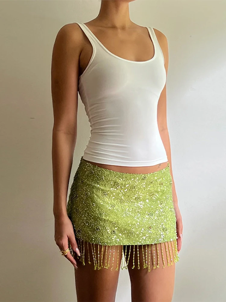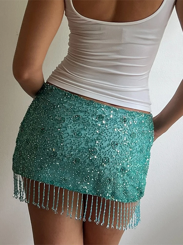 TAVIMART - Fringe Beaded Lolita Mini Skirt tassel Sequins Sparkling High Waist Sexy Slim Fit Wrap Hip Short Half Skirts Women's Clothing