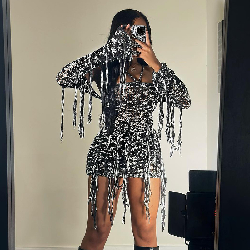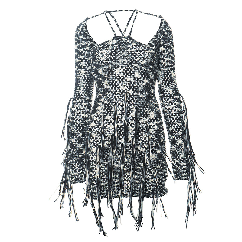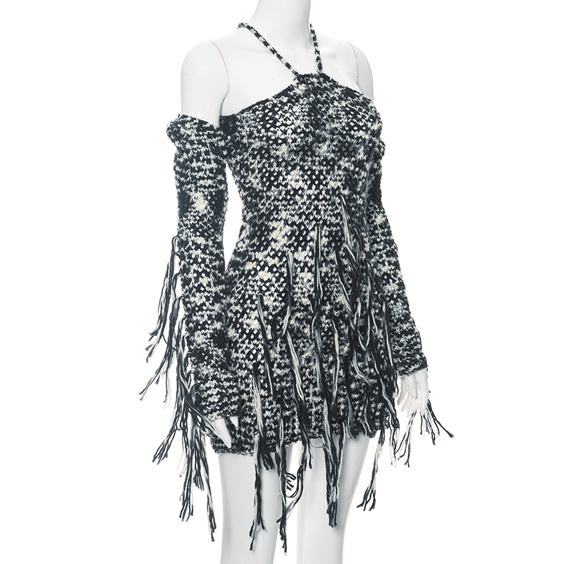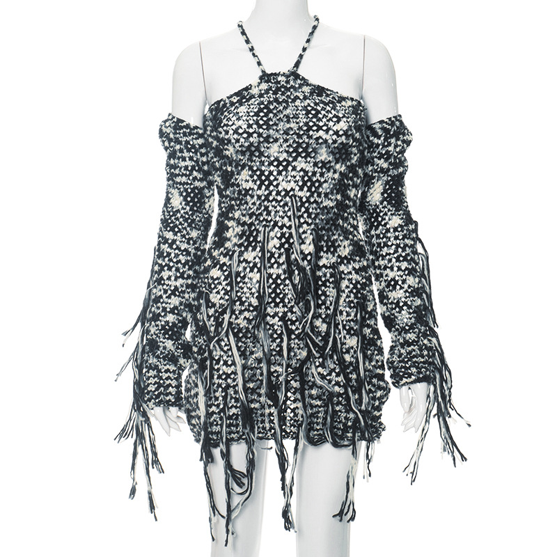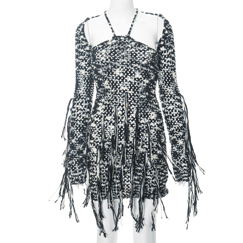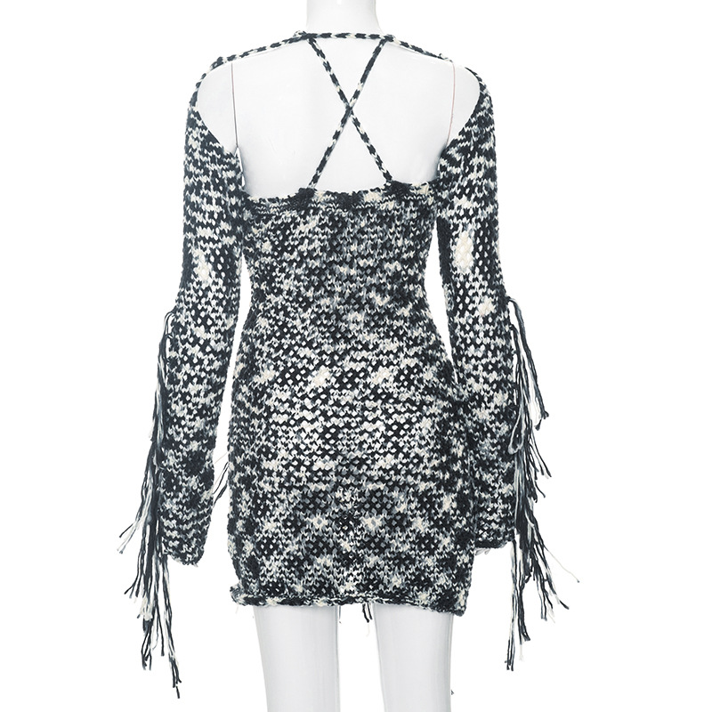 Tavimart - Fringed Knit Sweater Dress 2 Piece Set Streetwear Women 2024 Fashion Sexy Long Sleeve Backless Mini Dresses