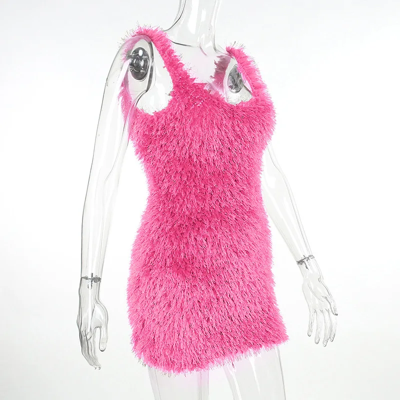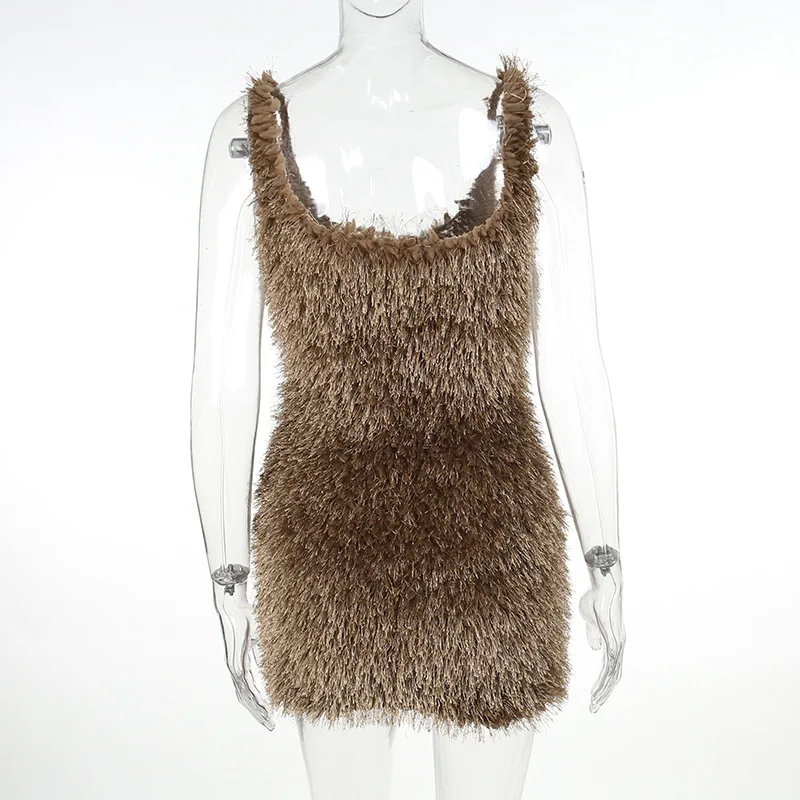 TAVIMART - Fur Sexy Backless Mini Wrap Dress Solid Luxury Women Club Party Outfit Casual Spaghetti Cloth Female Elastic Bodycon Dress