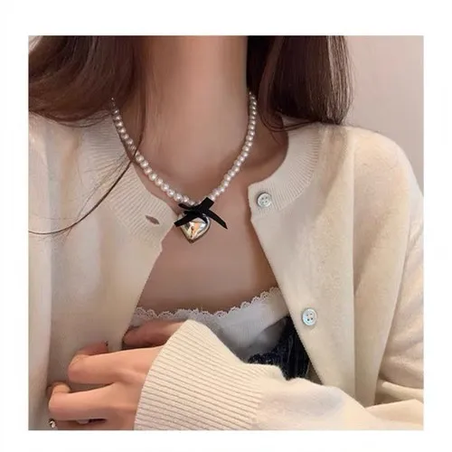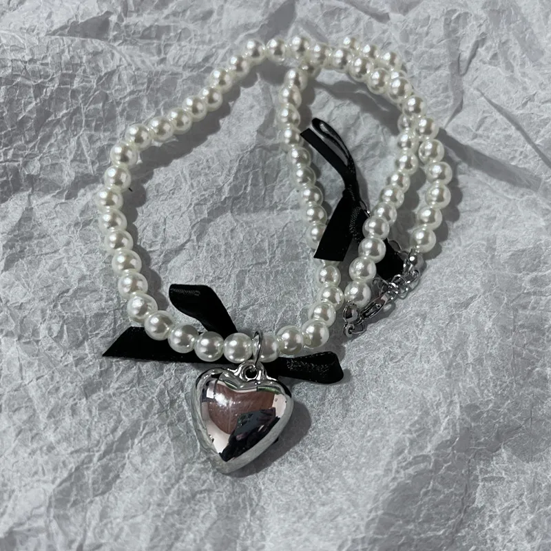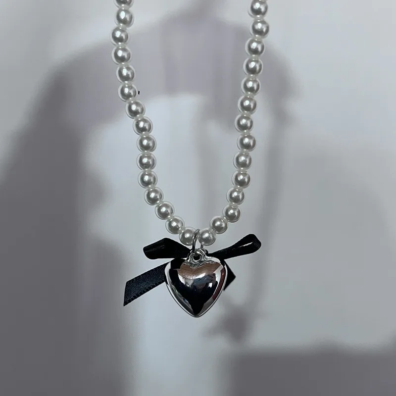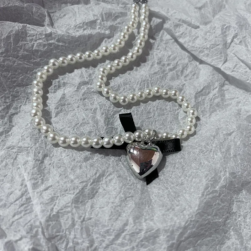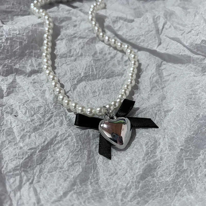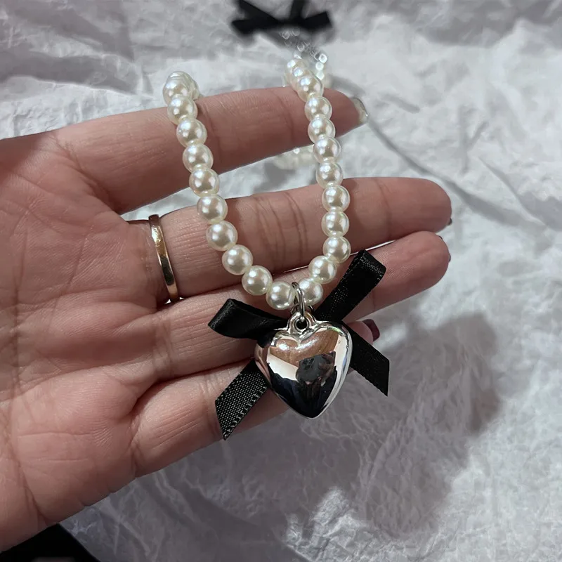 TAVIMART - Gothic Vintage Fashion Black Bow Heart Pendant Pearl Beaded Necklace For Girl EMO 2000s Harajuku Y2k Aesthetic Jewelry Accessory