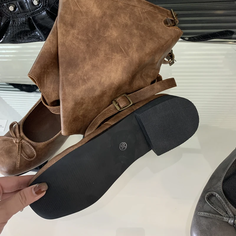 TAVIMART - Grey Ankle Boots For Women Low Heels Summer Ballet Shoes Retro Bow Round Toe Belt Buckle High Heels Botas Mujer