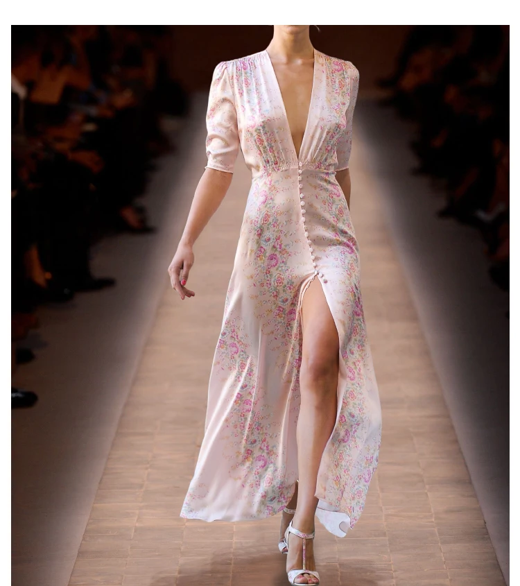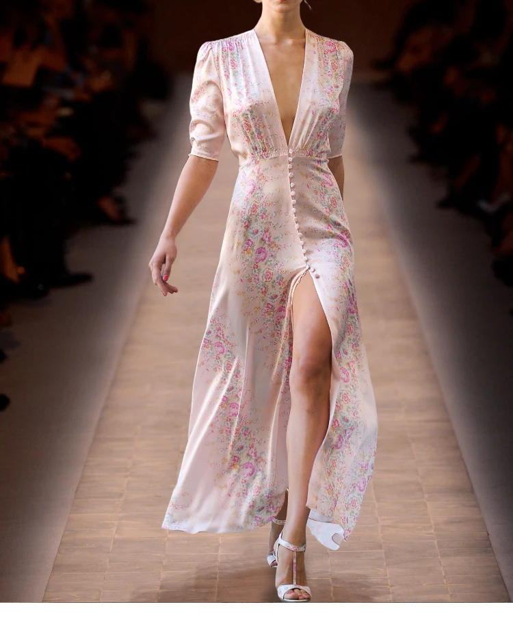 Tavimart High Quality Runway Designer Dress Women Elegant V-neck Pink Floral Printed Maxi Dress Summer Robe Longue