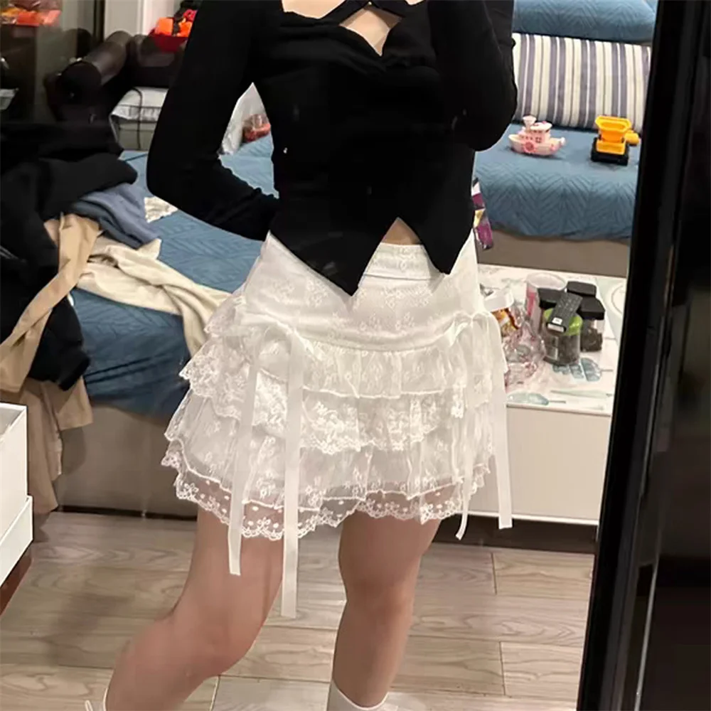 TAVIMART - High Waist Mesh Cutecore White Lace Cake Mini Skirt Japanese Style Preppy Style Bowknot Lolita Pumpkin Vintage Victorian Skirts
