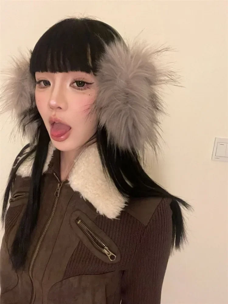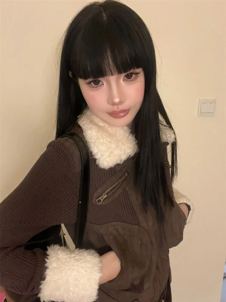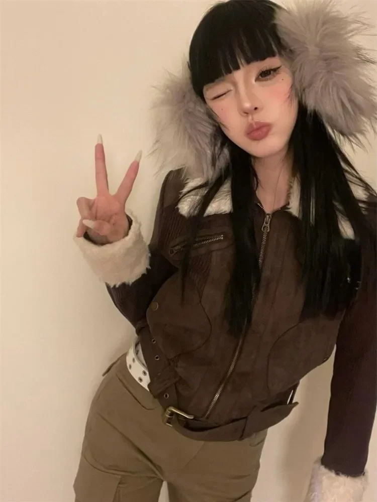 TAVIMART - Japanese Y2k Fur Coat Women American Retro Brown Knitted Jacket Vintage Korean Style Zipper Winter 2000s Aesthetics