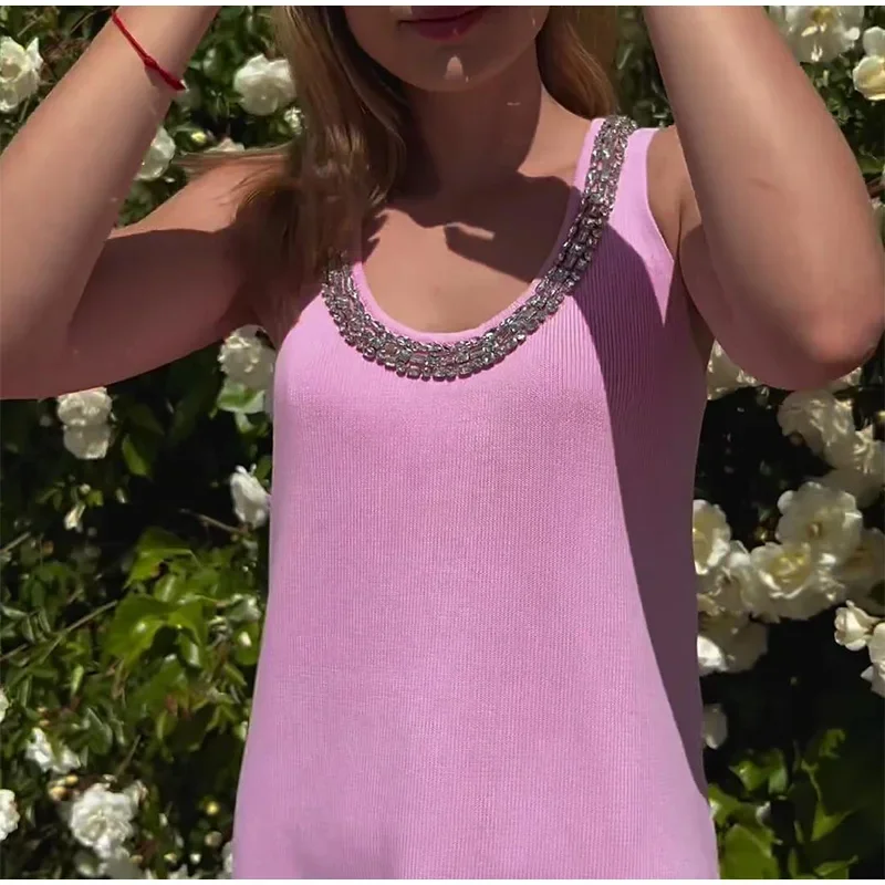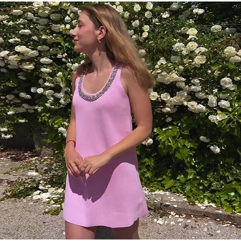 TAVIMART - Knitted Rhinestone Strap Mini Dress Women Casual Loose O-neck Short Sleeve Female Short Dresses 2024 Summer Lady Pink Vestidos