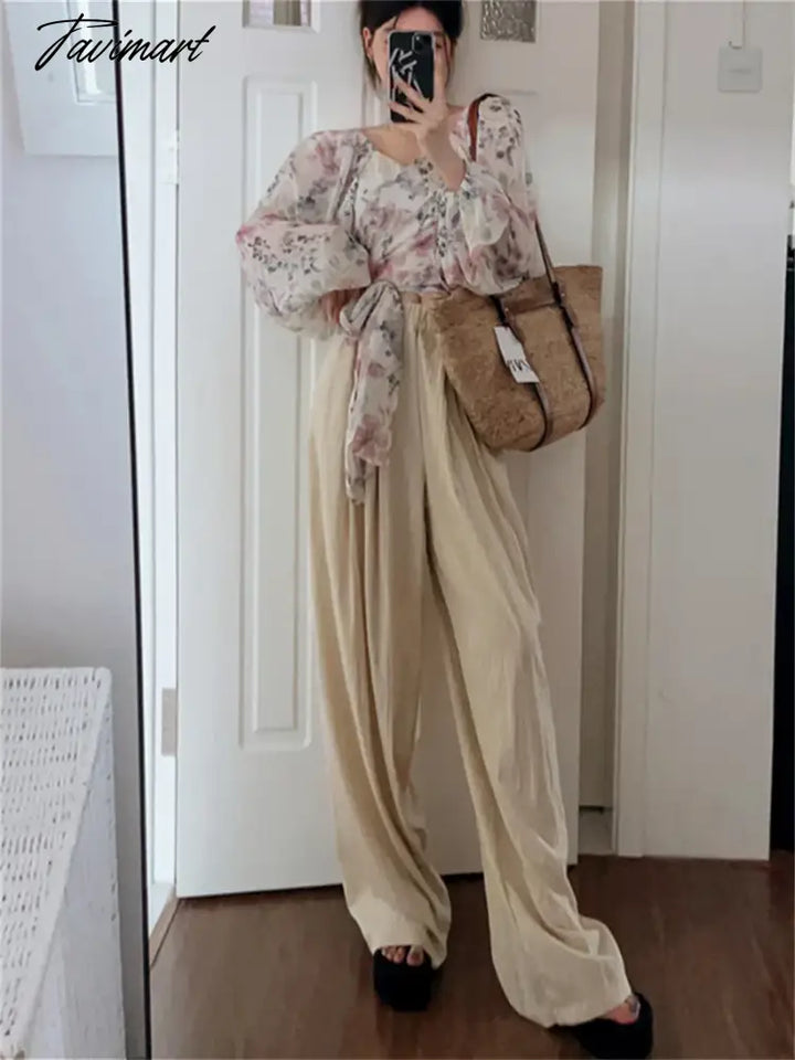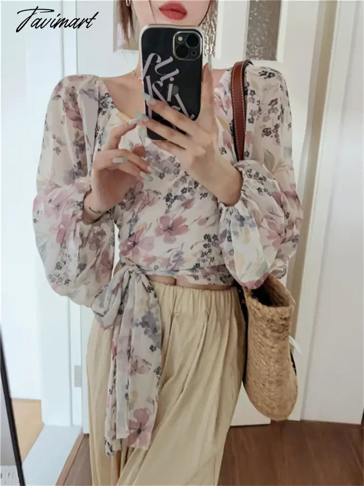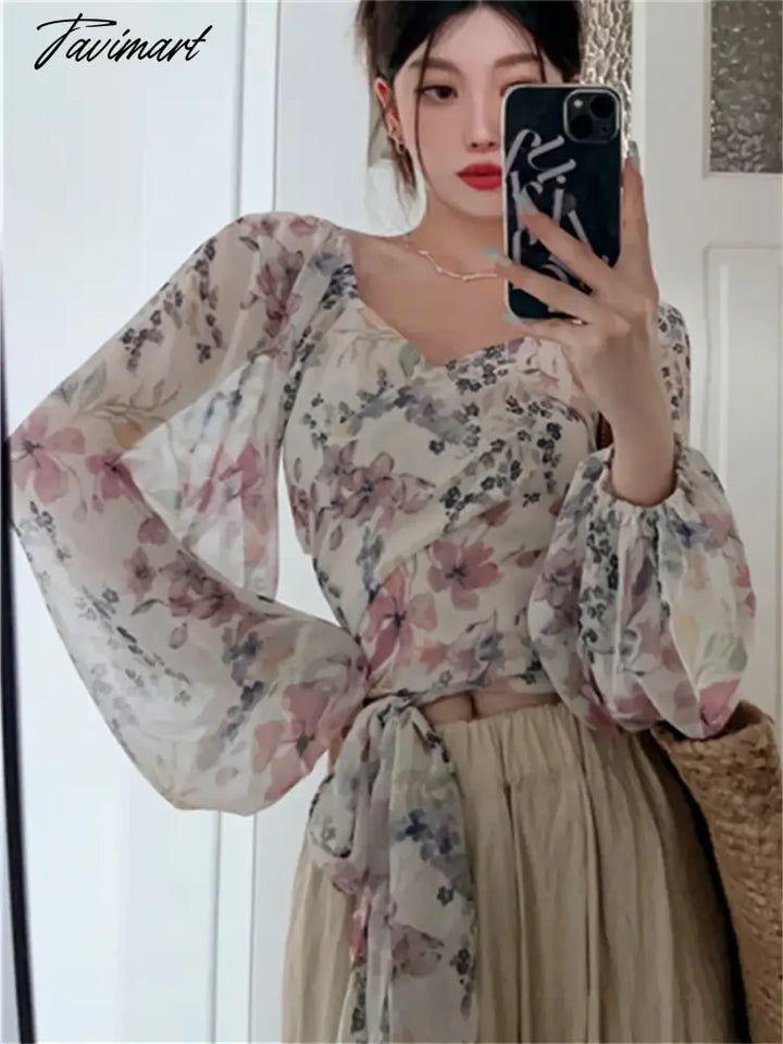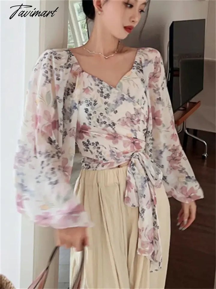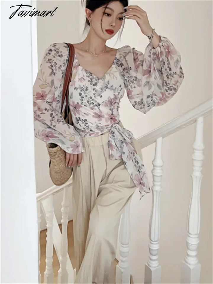 TAVIMART - Lantern Sleeve Women Thin Blouses Printed Chiffon Summer V-Neck 2023 Slim Thin Florals New Sexy Work Wear Gentle