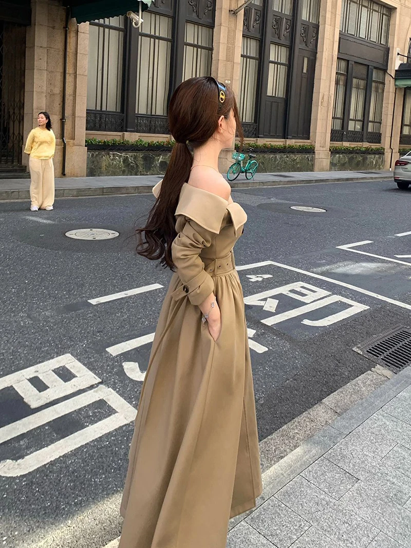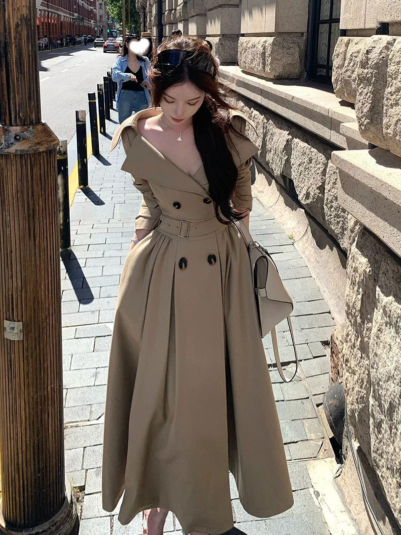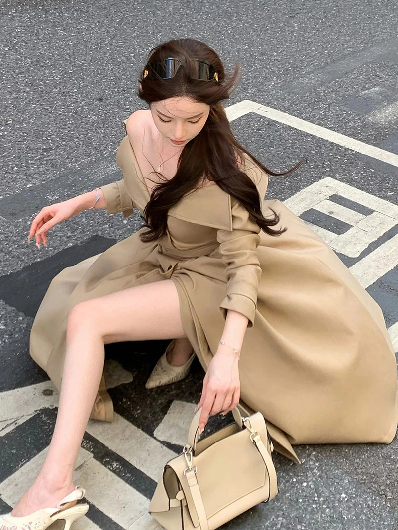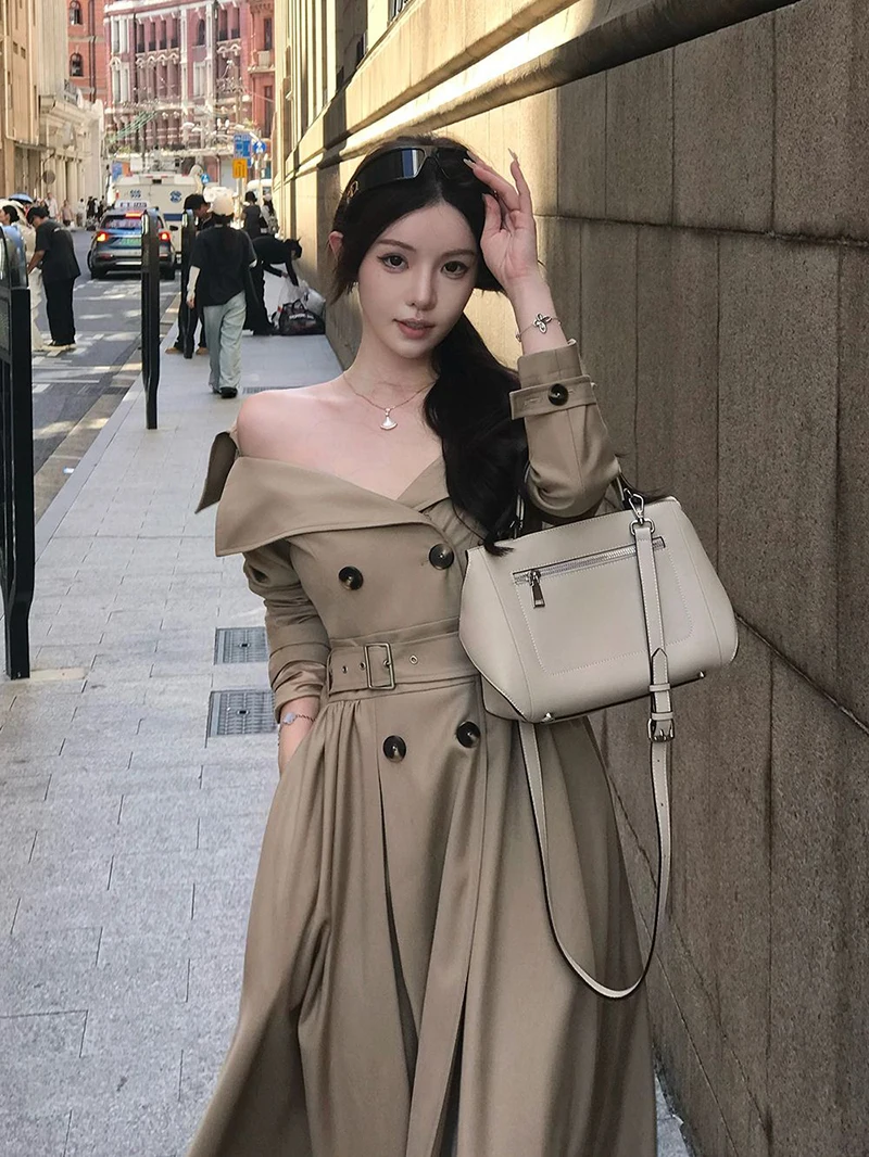 TAVIMART - Long Trench Coat Women Streetwear Belt Sexy Off Shoulder Jackets Korean Double Breasted Outerwears Fall Winter Fashion Overcoat