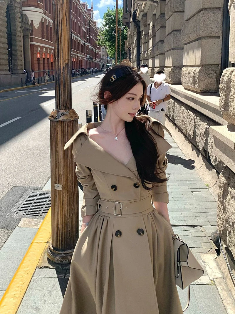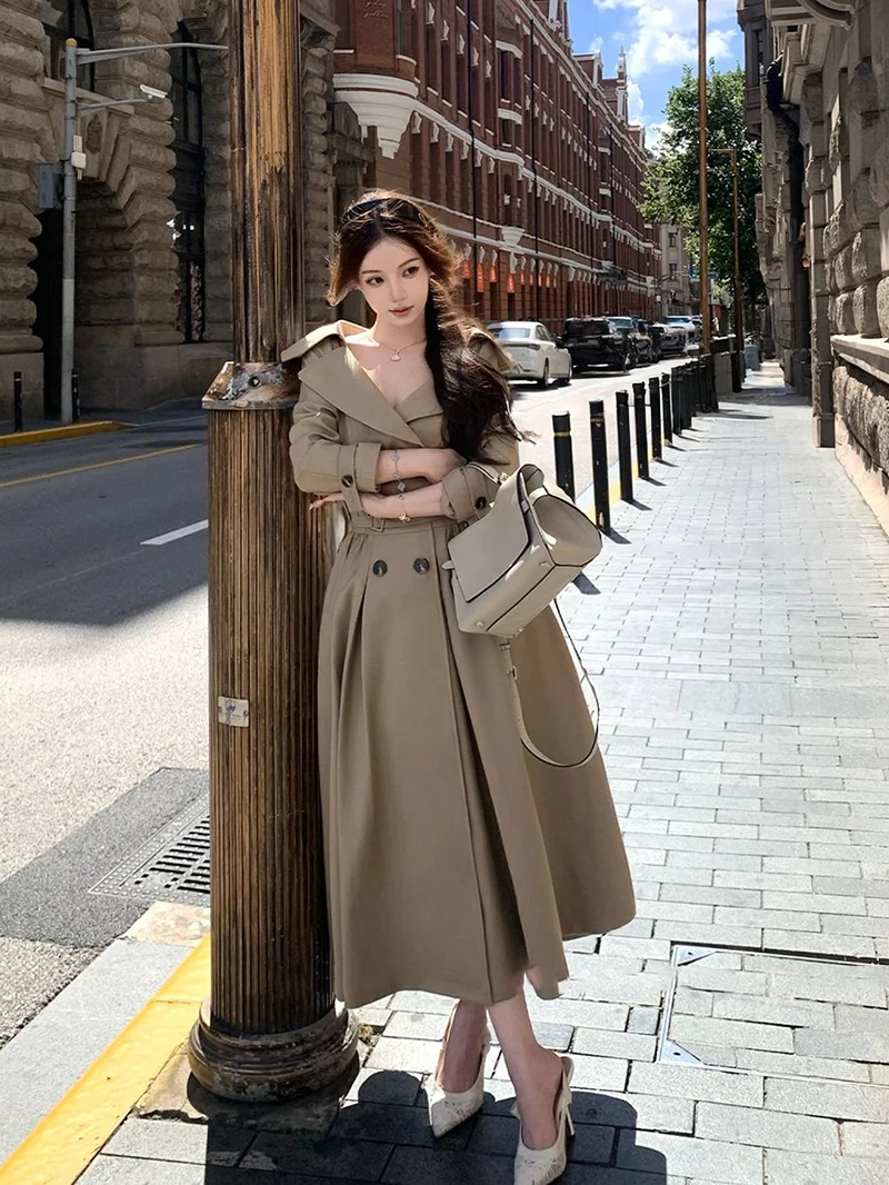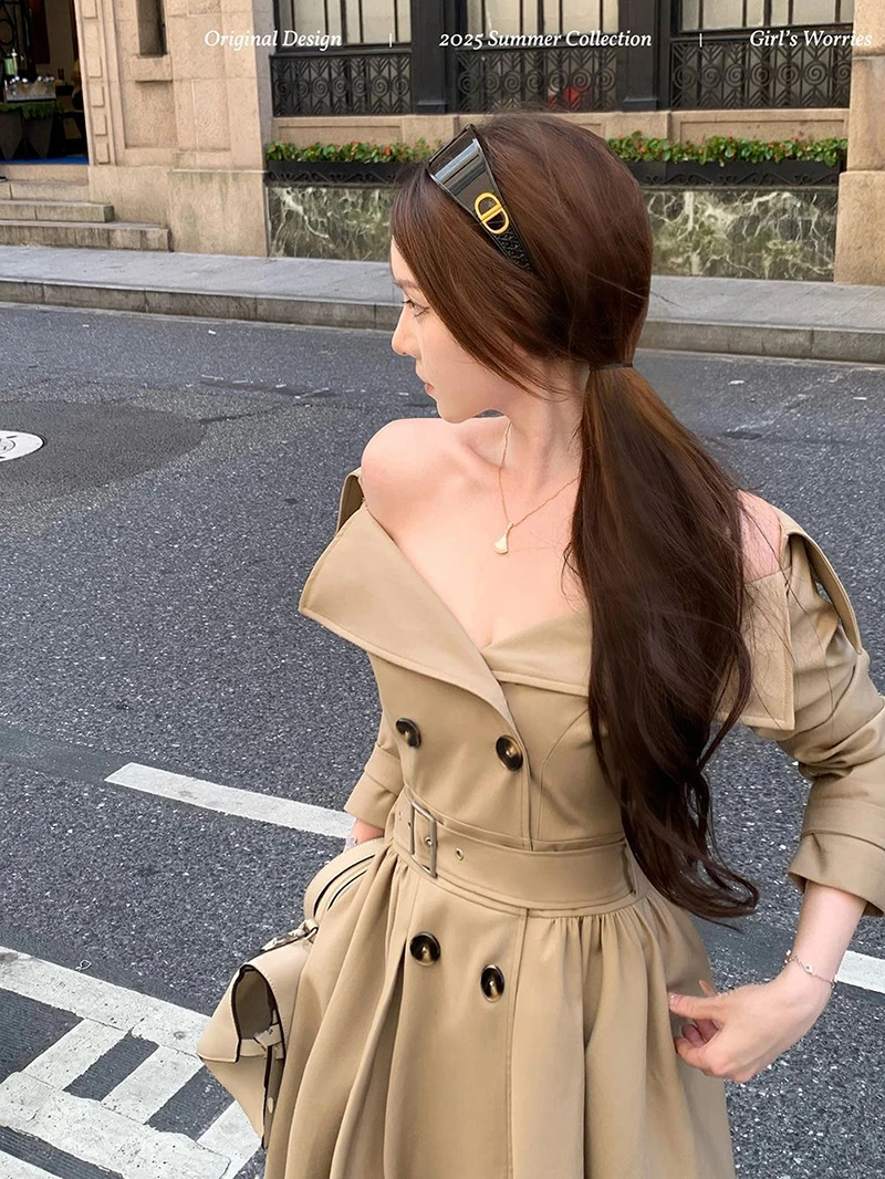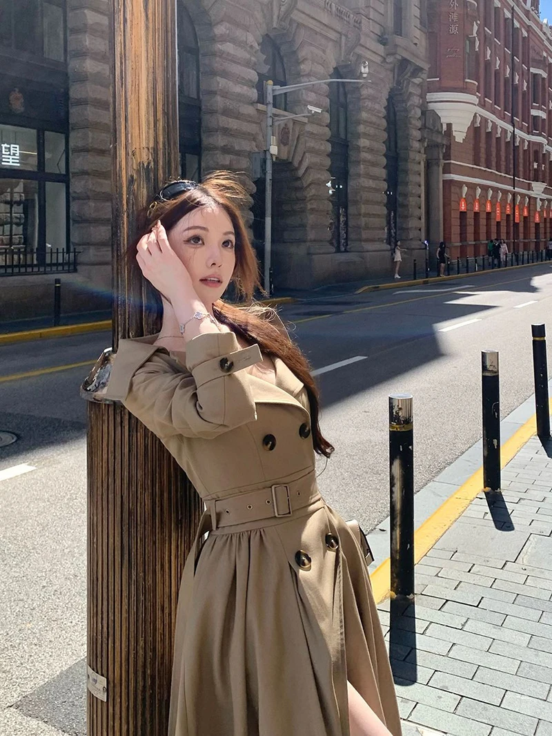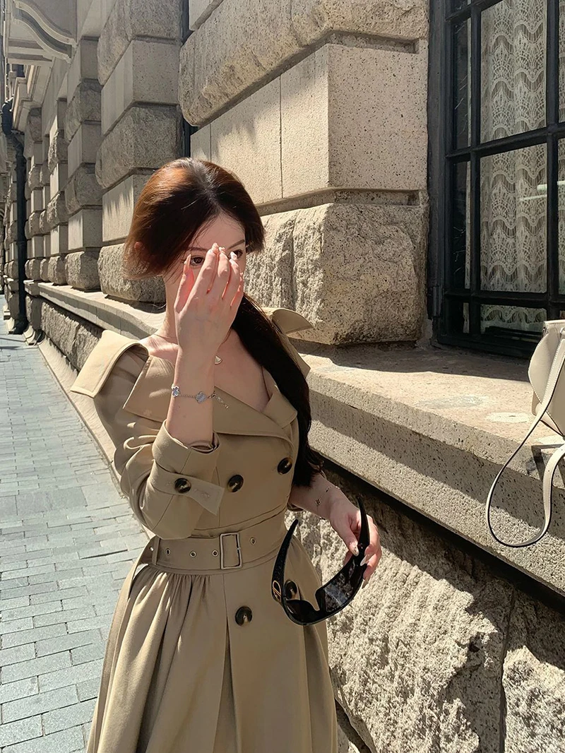TAVIMART - Long Trench Coat Women Streetwear Belt Sexy Off Shoulder Jackets Korean Double Breasted Outerwears Fall Winter Fashion Overcoat