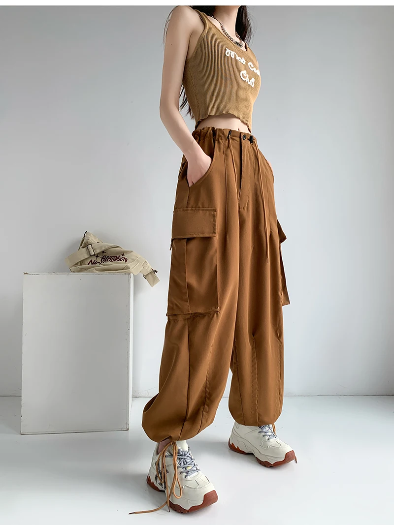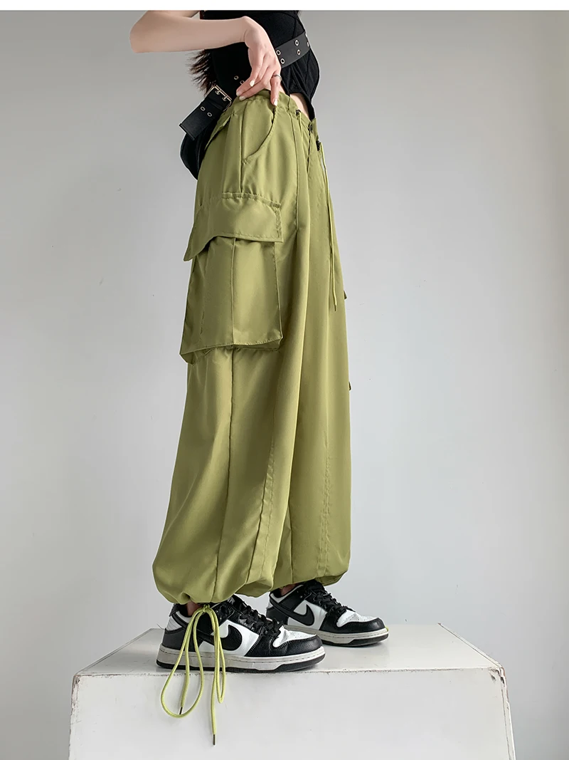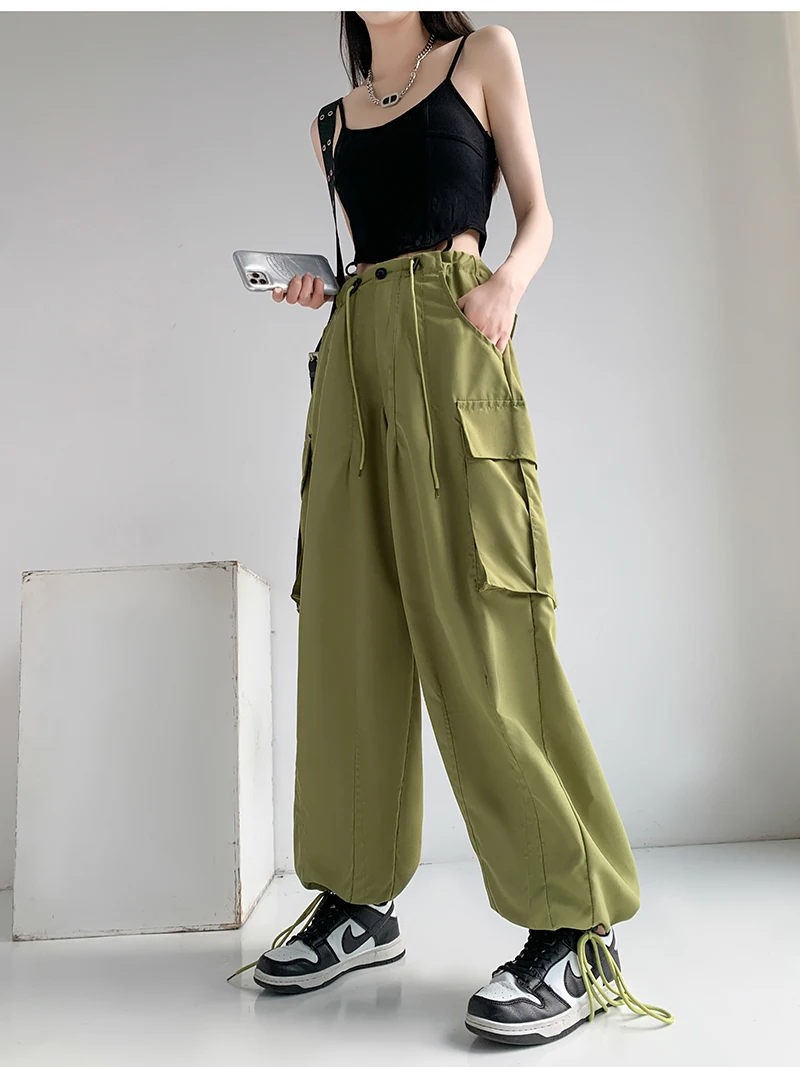 Tavimart Loose Casual Cargos Pants Wide Leg Pants Women New Drawstring Oversized Trousers Big Pocket Mid-Waist Ankle-Length Pants