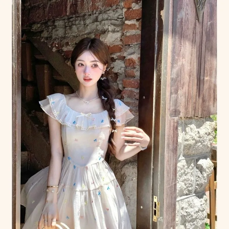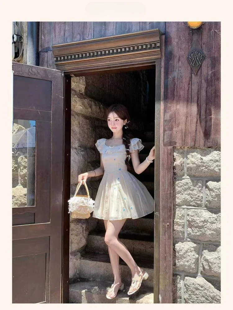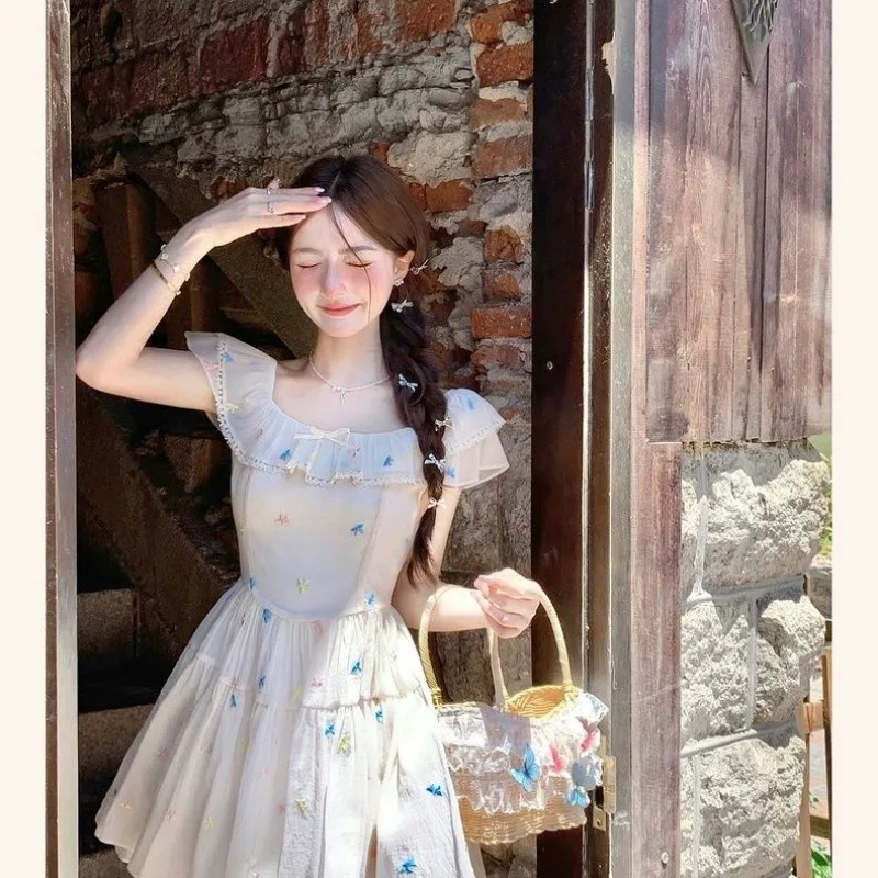 TAVIMART - Mini Dresses Women Bow Sweet Flying Sleeve Square Collar French Style Chic Spring Summer Party Mini Dress Princess Casual